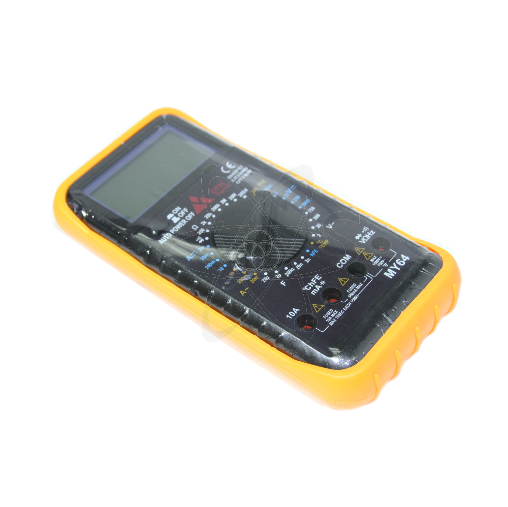 Цифровой мультиметр MY64 имеет богатый набор функций. С помощью него можно измерять величины силы постоянного и переменного тока, постоянного и переменного напряжения. сопротивления, коэффициента усиления биполярных транзисторов, емкость конденсаторов, температуру окружающей среды и частоту синусоидального сигнала в звуковом диапазоне. Высокое входное сопротивление не вносит погрешности при измерениях величин и говорит о высокой точности прибора. В приборе применен АЦП с измерением значений методом двойного интегрирования. Выбор пределов измерения величин производится вручную путем установки нужного положения многопозиционного переключателя. С помощью мультиметра MY64 можно проверятьполупроводниковые диоды и прозванивать электрические цепи. Яркий и заметный защитный кожух из мягкого полимера, входящий в комплект поставки мультиметра MY64, сохранит прибор от повреждения при падении или ударе. Рабочее положение измерительного прибора можно изменять с помощью упора на тыльной стороне корпуса.