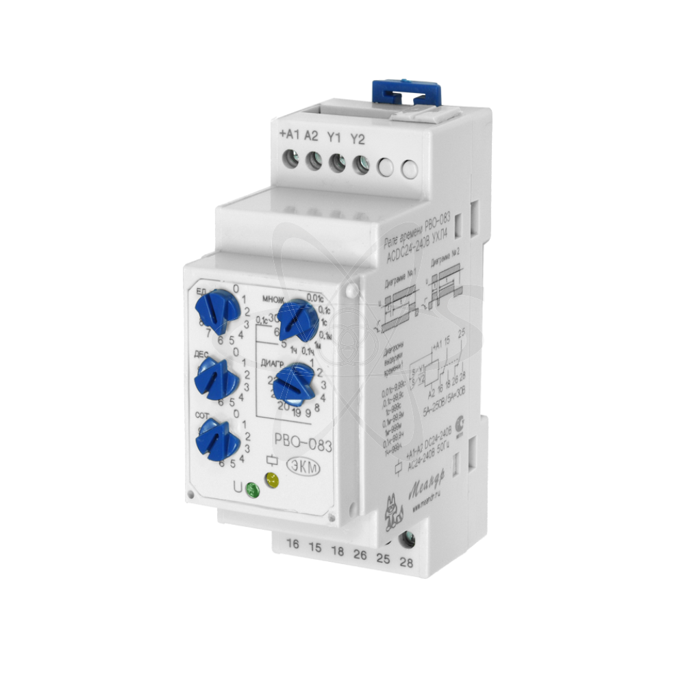 РВО-083 (далее-реле) реле времени предназначено для коммутации электрических цепей с предварительно установленной выдержкой времени и алгоритмом работы. Реле используется в системах автоматики, как комплектующее изделие. РВО-083 выпускаются в унифицированном пластмассовом корпусе модульного исполнения с передним присоединением проводов питания и коммутируемых электрических цепей. Монтаж осуществляется на рейку-DIN шириной 35мм (ГОСТ Р МЭК 60715-2003) или на монтажную панель. Для установки реле намонтажную панель, фиксаторы замков необходимо раздвинуть. Клемная конструкция обеспечивает зажим проводов сечением до 2,5мм2. На передней панели реле расположены: три поворотных переключателя установки выдержки времени t (установка значений единиц 0-9, десятков 0-9 и сотен 0-9), поворотный переключатель множитель, поворотный переключатель выбора диаграммы работы, зелёный светодиод включения напряжения питания «U», жёлтый светодиод срабатывания встроенного исполнительного реле. Реле не требует оперативного питания, питается от сети. Подключение питания производится к клеммам «+А1» и «А2». При использовании реле в цепях постоянного тока +Uпит подключается к клемме «+А1». Реле имеет 7 диапазонов выдержки времени. Требуемая временная выдержка t определяется путём умножения числового значения, установленного переключателями «ЕД.», «ДЕС.» и «СОТ.» на коэффициент устанавливаемый переключателем «МНОЖ.». Переключатель «множитель» имеет три дополнительных положения: «5» реле работает по диаграмме №5 - подсчёт количества импульсов установленного переключателями «единицы», «десятки» и «сотни». «6» реле работает по диаграмме №6 - подсчёт количества импульсов установленного переключателями «единицы», «десятки» и «сотни». «30» реле работает по диаграмме №30 - время t определяются путём умножения числового значения, установленного переключателями «единицы», «десятки» и «сотни» только на коэффициент 0,1с. Диаграмма работы реле выбирается с помощью переключателя «диаграмма». Переключатель имеет десять положений «1»-«2»-«3»-«4»-«8»-«9»-«19»-«20»-«21»-«22» и определяет номер диаграммы работы реле. В случае когда переключатель «множитель» установлен в одно из трёх положений т.е диаграммы (5:6: и 30) переключатель «диаграмма» не определяет номер диаграмм.