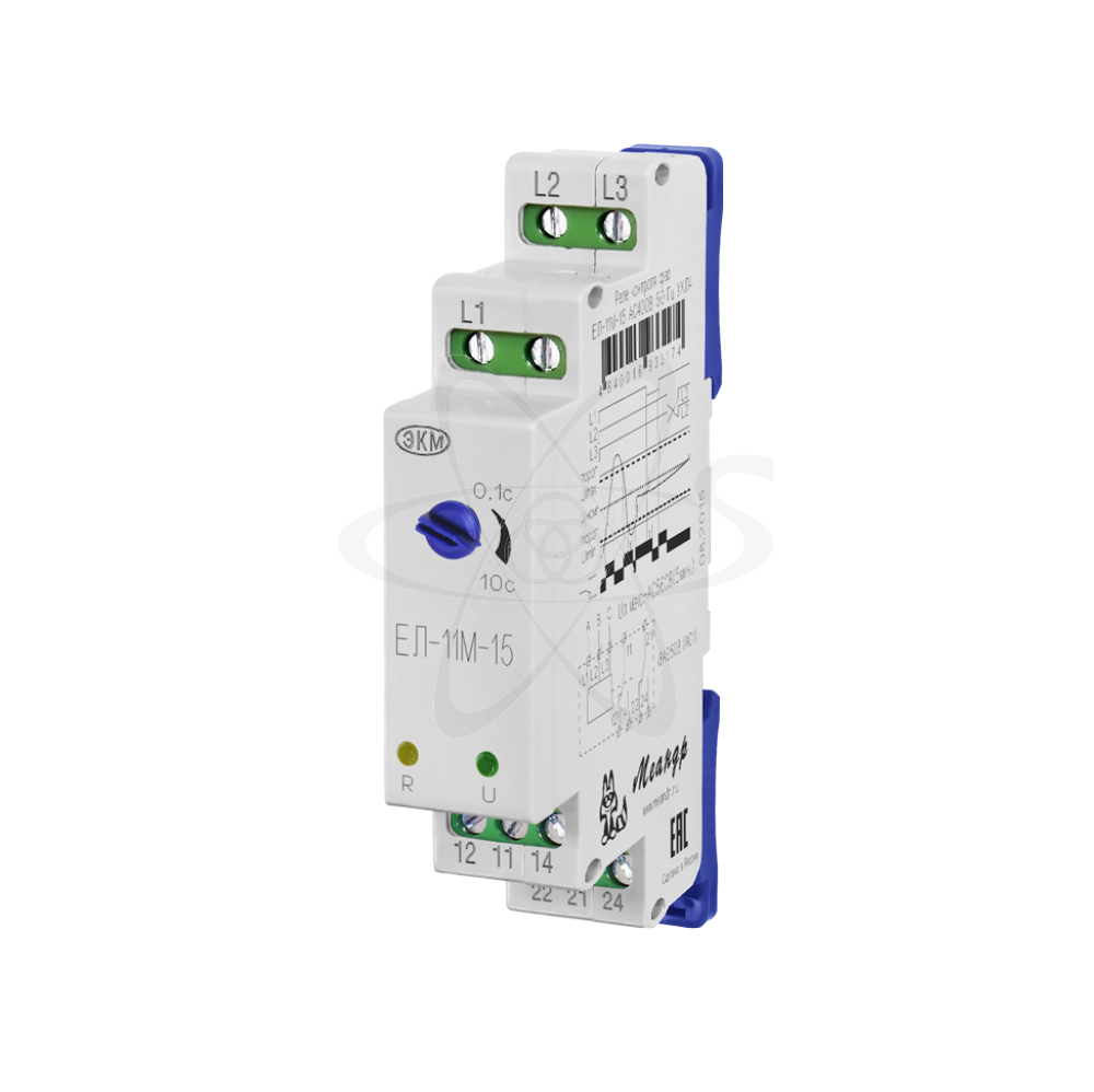 ЕЛ-11М-15 (далее-реле) реле контроля фаз предназначено для использования в схемах автоматического управления для контроля напряжения в трёхфазных сетях без нулевого провода,обрыва и «слипания» фаз, для контроля порядка чередования фаз, снижения (превышения) напряжения ниже (выше) фиксированного значения, а также контроля асимметрии фаз. Реле предназначено для защиты источников и преобразователей электрической энергии. Реле выпускаются в унифицированном пластмассовом корпусе модульного исполнения с передним присоединением проводов питания и коммутируемых электрических цепей. Монтаж осуществляется на рейку-DIN шириной 35 мм (ГОСТ Р МЭК 60715-2003) или на монтажную панель. Для установки реле на монтажную панель, фиксаторы замков необходимо переставить в крайние отверстия, расположенные на тыльной стороне корпуса. Клемная конструкция обеспечивает надёжный зажим проводов сечением до 2,5 мм2. На передней панели прибора расположены: регулятор времени срабатывания, зелёный светодиод наличия напряжения питания в трёхфазной цепи «U» и жёлтый светодиод включения встроенного исполнительного реле «R». При подаче на реле трёхфазного напряжения включается светодиод «U» и осуществляется проверка всех контролируемых параметров. Если все параметры в норме, включается встроенное исполнительное реле (контакты 11 - 14 и 21 - 24 замыкаются, контакты 11 - 12 и 21 - 22 размыкаются) и включается светодиод «R». При обнаружении обратного порядка чередования фаз, пропадании двух или трёх фаз, при превышении фиксированного порога напряжения - реле выключается без отсчёта установленной задержки времени срабатывания. При асимметрии напряжения, снижении напряжения ниже фиксированного порога или обрыве одной из фаз, реле выключается через время t, установленное регулятором времени срабатывания. При возвращении параметров в норму реле включается без задержки. Работа реле представлена на диаграмме, где t - установленная выдержка времени. Напряжение фаз А, В, С контролируемой сети подключается соответственно к клеммам L1, L2, L3 реле. Выходные контакты реле подключаются к схеме управления. Если реле подключено правильно, горят зелёный и жёлтый светодиоды. Если горит только зелёный светодиод, следует проверить значение напряжения на клеммах реле и правильность порядка чередования подключённых фаз.