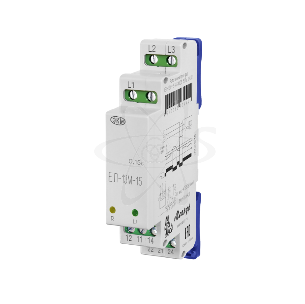 ЕЛ-13М-15 (далее-реле) реле асимметрии фаз предназначены для контроля трёхфазного линейного напряжения в трёхпроводных сетях (без нейтрали). Реле контролирует обрыв и «слипание» фаз, асимметрию (разбаланс) линейных напряжений, превышение напряжения выше фиксированного значения. Реле выпускаются в унифицированном пластмассовом корпусе модульного исполнения с передним присоединением проводов питания и коммутируемых электрических цепей. Монтаж осуществляется на рейку - DIN шириной 35 мм (ГОСТ Р МЭК 60715 - 2003) или на монтажную панель. Для установки реле на монтиажную панель, фиксаторы замков необходимо развинуть.Клемная конструкция обеспечивает надёжный зажим проводов сечением до 2,5мм2. На передней панели прибора расположены: зелёный светодиод «U» показывающий наличие напряжения в трёхфазной сети, жёлтый светодиод «R» включения встроенного исполнительного реле. Напряжение фаз А, В, С контролируемой сети подключается соответственно к клеммам L1, L2, L3 реле (нулевой провод не подключается). Выходные контакты реле подключаются к схеме управления. При подаче на реле трёхфазного напряжения осуществляется проверка всех контролируемых параметров и, если они в норме, реле включается (контакты 11-14, 21-24 - замыкаются,контакты 11-12, 21-22 - размыкаются ). При выходе хотя бы одного параметра за пределы допустимых величин, встроенное реле выключается через 0.15 с. При возвращении параметров в норму реле включается и вновь осуществляется контроль напряжения сети.