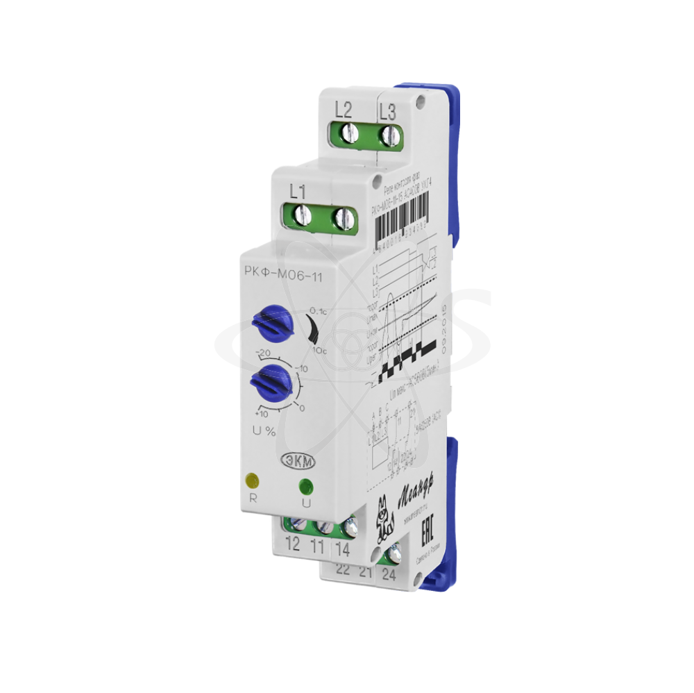 РКФ-М06-11-15 (далее-реле) реле контроля фаз предназначено для контроля трёхфазного линейного напряжения в трёхпроводных сетях (без нейтрали). Реле контролирует порядок обрыв и «слипание» фаз,чередования фаз , асимметрию напряжения, снижение напряжения ниже установленного порога,превышение напряжения выше фиксированного значения. Реле выпускаются в унифицированном пластмассовом корпусе модульного исполнения с передним присоединением проводов питания и коммутируемых электрических цепей. Монтаж осуществляется на рейку-DIN шириной 35мм (ГОСТ Р МЭК 60715-2003) или на монтажную панель. Для установки реле на монтажную панель, фиксаторы замков необходимо раздвинуть. Клемная конструкция обеспечивает надёжный зажим проводов сечением до 2,5мм2. На передней панели прибора расположены: декадный переключатель времени срабатывания, декадный переключатель порога срабатывания «Uф%», зелёный светодиод «U» наличия напряжения питания. Жёлтый светодиод "R"включения встроенного исполнительного реле. Напряжение фаз А, В, С контролируемой сети подключается соответственно к клеммам L1, L2, L3 . Выходные контакты реле подключаются к схеме управления. Если реле подключено правильно, горят жёлтый и зелёный светодиоды. Если горит только зелёный светодиод, следует проверить напряжение на клеммах и правильность порядка чередования подключённых фаз. При подаче питания на реле загорается зелёный светодиод «U» и осуществляется проверка всех контролируемых параметров. Если все параметры в норме, включается встроенное исполнительное реле (размыкаются контакты 11-12 и 21-22 , контакты 11-14 и 21,24-замыкаются) и загорается жёлтый светодиод «R». При обнаружении обратного порядка чередования фаз, пропадании двух или трёх фаз или при превышении фиксированного порога напряжения равного 1,3Uном - реле выключается без отсчёта установленной задержки времени срабатывания. При отклонении Uном от значения установленного порога, при «слипании» фаз или при обрыве одной фазы, при асимметрии фаз, реле выключается через время t, установленное пользователем. При возвращении параметров в норму реле включается без задержки. Работа реле представлена на рис. 1, где «t» - установленная выдержка времени.