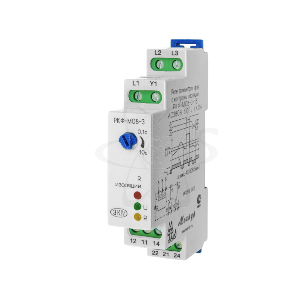РКФ-М08-1-15 (далее-реле) реле асимметрии фаз с контролем изоляции предназначено для контроля трёхфазного линейного напряжения в трёхпроводных сетях (без нейтрали) с предпусковым контролем сопротивления изоляции обмоток двигателя. Также реле может использоваться в четырёхпроводных сетях (с нейтралью), но при этом функция контроля сопротивления изоляции работать не будет. Реле контролирует обрыв фаз, «слипание» фаз, порядок чередования фаз,снижение ( превышение) напряжения ниже (выше) фиксированного значения. Реле выпускаются в унифицированном пластмассовом корпусе модульного исполнения с передним присоединением проводов питания и коммутируемых электрических цепей. Монтаж осуществляется на рейку-DIN (ГОСТ Р МЭК 60715-2003) или на монтажную панель. Для установки реле на монтажную панель пружины замков необходимо раздвинуть. Клемная конструкцуия обеспечивает надёжный зажим проводов сечением до 2,5мм2. На передней панели прибора расположены:декадный переключатель времени срабатывания, красный светодиод сопротивления изоляции «R изоляции», зелёный светодиод «U» наличия напряжения в трёхфазной сети, жёлтый светодиод «R» включения встроенного исполнительного реле. При использовании реле в трёхпроводных сетях (без нейтрали), фазы А, В, С контролируемой сети подключаются соответственно к клеммам «L1», «L2», «L3». Для осуществления контроля изоляции клемму «Y1» необходимо соединить с одной из фаз после контактов магнитного пускателя (на двигателе). Выходные контакты реле 14-11-12 подключаются к схеме управления работой двигателя. Контроль сопротивления изоляции двигателя относительно земли осуществляется сразу после подачи на реле трёхфазного напряжения, если клемма «Y1» соединена с одной из фаз на двигателе и все параметры сети в норме. В противном случае реле не включится и измерение сопротивление изоляции осуществляться не будет (индикаторы «R» и «R изоляции» выключены). Если контролируемые параметры сети в норме, а сопротивление изоляции обмоток двигателя окажется ≤ 500 кОм, исполнительное реле останется выключенным и будет мигать красный светодиод «R изоляции». Если сопротивление изоляции двигателя >500 кОм, начинается непрерывный анализ всех параметров сети. Когда они остаются в норме, исполнительное реле и жёлтый светодиод «R» включены (замкнуты контакты 11-14 и 21-24). При возникновении неисправности на выходе , хотя бы одного параметра за пределы допустимых величин, исполнительное реле и светодиод «R» выключаются (замыкаются контакты 11-12 и 21-22 ). При обнаружении обратного порядка чередования фаз, при пропадании двух или трёх фаз или при превышении фиксированного порога напряжения - исполнительное реле выключается без отсчёта установленной задержки времени срабатывания. При снижении напряжения ниже фиксированного порога или при обрыве одной фазы, реле выключается через время t, установленное регулятором времени срабатывания на лицевой панели реле. При возвращении параметров в норму, реле включается сразу, без учёта этой задержки. При использовании реле в четырёхпроводных сетях с изолированной нейтралью фазы А, В, С подключается соответственно к клеммам «L1», «L2», «L3» реле, при этом клемма «Y» не задействована и контроль сопротивления изоляции отсутствует.