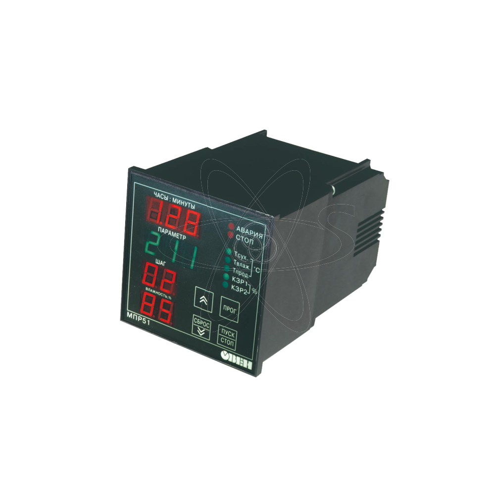 Программный задатчик ОВЕН МПР51-Щ4 предназначен для управления многоступенчатыми температурно-влажностными режимами технологических процессов при производстве мясных и колбасных изделий, в хлебопекарной промышленности, в инкубаторах, термо- и климатокамерах, варочных и сушильных шкафах, при сушке древесины, изготовлении железобетонных конструкций и пр. Функциональные возможности прибора ОВЕН МПР51: измерение трех параметров: температуры камеры («сухого» термометра) Тсух; температуры «влажного» термометра Твлаж; температуры продукта Тпрод. Вычисление двух дополнительных параметров: разности температур ΔТ = Тсух – Тпрод; влажности Ψ психрометрическим методом (по показаниям «сухого» и «влажного» термометров). Два ПИД-регулятора для поддержания любых двух из пяти вышеперечисленных величин с высокой точностью. Четыре выходных реле для подключения ТЭНов, охладительных систем, задвижек и других исполнительных устройств. Регулирование по заданной пользователем программе. Дополнительное реле и 8 транзисторных ключей: для сигнализации об аварии и об окончании выполнения программы; для управления дополнительным оборудованием. Автонастройка ПИД-регуляторов. Уровни защиты настроек прибора для разных групп специалистов (наладчиков, технологов и т. д.). Регистрация контролируемых параметров на ПК через адаптер сети ОВЕН АС2 по интерфейсу RS-232. Встроенный интерфейс RS-485 по заказу. Конфигурирование на ПК с помощью программы-конфигуратора (для подключения к ПК используется специальный кабель).