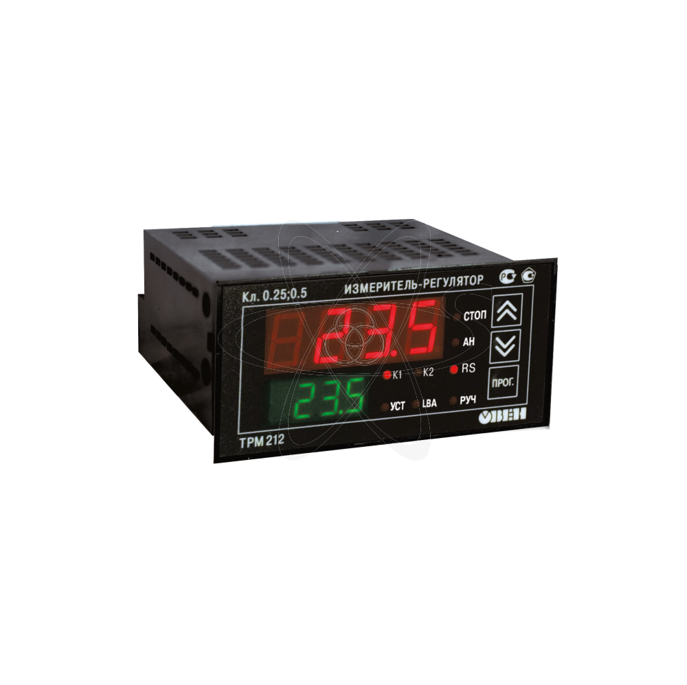 ОВЕН ТРМ212 является аналогом ТРМ12 с дополнительным входом и интерфейсом RS-485. Рекомендуется для управления задвижками с электроприводом и клапанами: в системах ГВС, парового и газового отопления; в теплообменных аппаратах (пастеризаторах); при подаче охлаждающей жидкости в контурах водяных охладителей; при регулировании соотношения воздух/газ, а также в другом технологическом оборудовании, где используются запорно-регулирующие либо трехходовые клапаны и задвижки с электроприводом. Класс точности 0,25 /0,5. Прибор выпускается в четырех типах корпусов:щитовых Щ1, Щ2 , настенном Н и новом эргономичном корпусе Н2. Основные функции ТРМ212: 2 универсальных входа для подключения широкого спектра датчиков давления,температуры, расхода, уровня, влажности, и т. д. Также имеет возможность работы с датчиками, имеющими квадратичную характеристику. Вычисление суммы,разности,отношения и корня из разности двух измеряемых величин.Измерение и регулирование расхода по перепаду давления на стандартных сужающих устройствах (диафрагма, сопло и трубка Вентури) без применения диф. манометра. ПИД-регулирование вычисленной либо измеренной величины с использованием: электропривода запорно-регулирующего (КЗР) или трехходового клапана, задвижки с аналоговым входом 4…20 мА или 0…10 В в ручном,автоматическом и дистанционном режимах. Автоматическая настройка ПИД-регулятора по современному алгоритму, оптимизация выхода на уставку. Подключение датчика положения задвижки ко входу 2. График коррекции уставки регулятора по величине, измеренной на втором входе. Сигнализация об обрыве в цепи регулирования (LBA).Дистанционный пуск и остановка ПИД-регулятора. Встроенный интерфейс RS'485 (протокол ОВЕН, Modbus ASCI/RTU). Уровни защиты настроек для разных групп специалистов.Конфигурирование на ПК или с передней панели прибора.