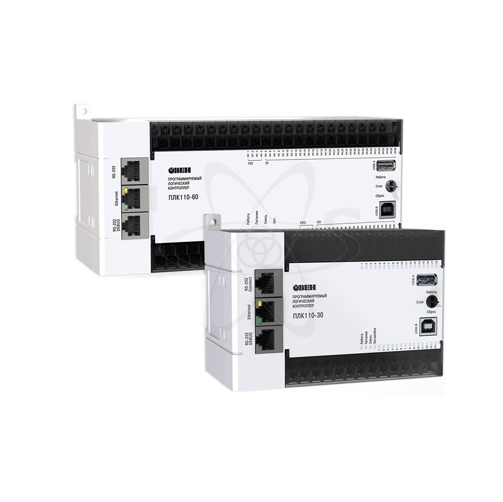ОВЕН ПЛК110[М02] – линейка программируемых моноблочных контроллеров с дискретными входами/выходами на борту для автоматизации средних систем. Оптимальны для построения систем автоматизации среднего уровня и распределенных систем управления. Изделие предназначено для построения распределенных систем управления и диспетчеризации с использованием как проводных, так и беспроводных технологий: В системах HVAC. В сфере ЖКХ (ИТП, ЦТП). АСУ водоканалов линии по дерево- и металлообработке (распил, намотка и т.д.). Для управления пищеперерабатывающими и упаковочными аппаратами. Для управления климатическим оборудованием. Для автоматизации торгового оборудования. В сфере производства строительных материалов. Для управления малыми станками и механизмами. Преимущества ОВЕН ПЛК110[М02]: Наличие встроенных дискретных входов/выходов на борту. Скоростные входы для обработки энкодеров. Ведение архива работы оборудования или работа по заранее оговоренным сценариям при подключении к контроллеру USB-накопителей. Простое и удобное программирование в системе CODESYS v.2 через порты USB Device, Ethernet, RS-232 Debug. Передача данных на верхний уровень через Ethernet или GSM-сети (GPRS). 4 последовательных порта (RS-232, RS-485) для: увеличения количества входов-выходов; управления частотными преобразователями; подключения панелей операторов, GSM-модемов, считывателей штрих-кодов и т.д. Наличие двух исполнений по питанию (220 В и 24 В). Отличия обновленной линейки ПЛК110-24.30.Р-М[М02]: Увеличена скорость опроса быстрых дискретных входов (до 100 кГц). Интерфейсы RS-232 прибора позволяют осуществлять питание подключённых устройств. Ведение архива/хранение рецептов на USB-носителе.Количество энкодеров - 1 АВ,точек ввода/ вывода-32 Расширенный температурный диапазон: от -40 до +55 °С.