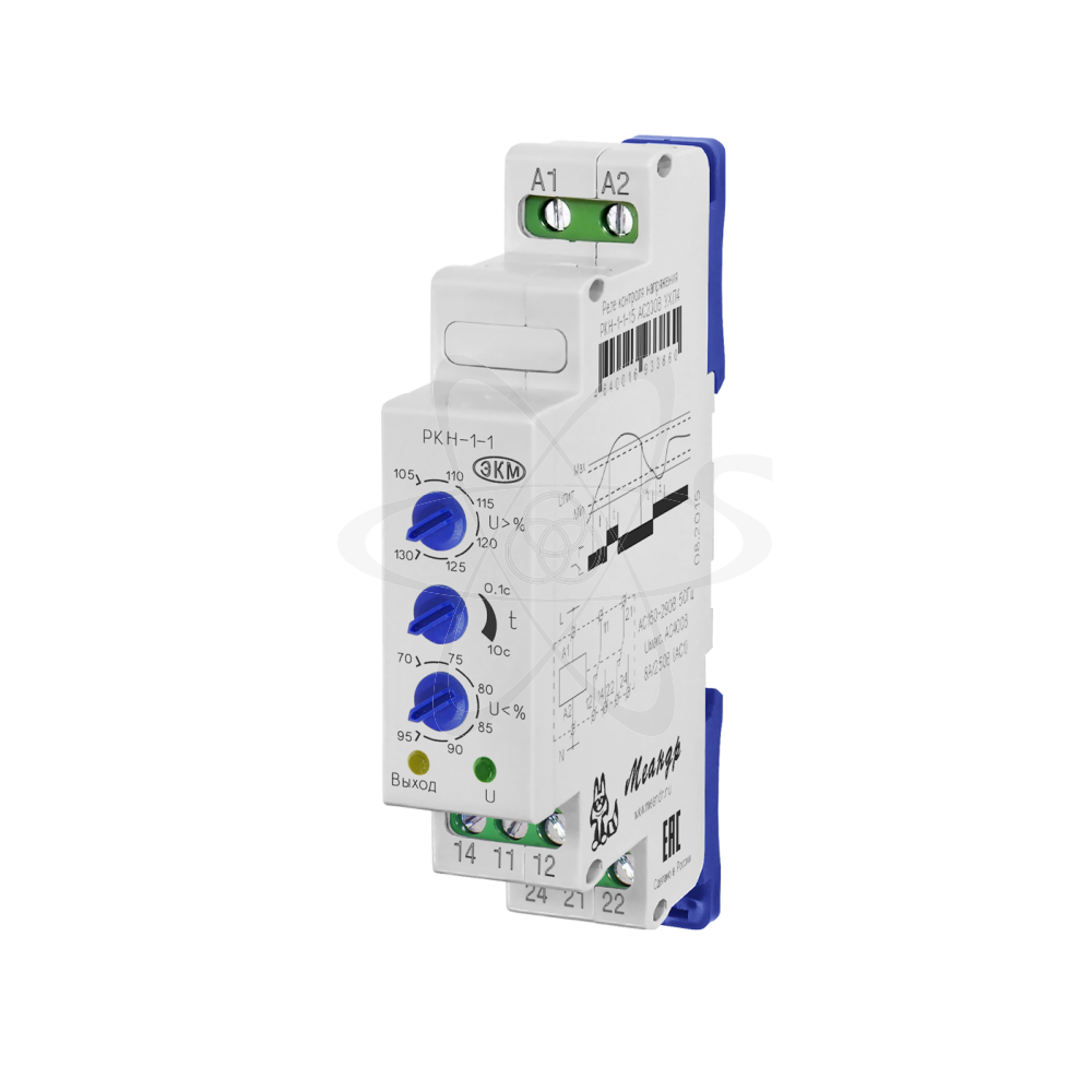 РКН-1-1-15 (далее-реле) реле контроля напряжения предназначено для защиты электрооборудования от работы на пониженном или повышенном напряжении из-за неполадок в сети. Питание реле осуществляется от контролируемого напряжения сети, отдельного напряжения питания не требуется.Реле выпускаются в унифицированном пластмассовом корпусе модульного исполнения с передним присоединением проводов питания и коммутируемых электрических цепей. Монтаж осуществляется на рейку-DIN шириной 35 мм (ГОСТ Р МЭК 60715 - 2003) или на монтажную панель. Для установки реле на монтажную панель, фиксаторы замков необходимо раздвинуть. Клемная конструкция обеспечивает надежный зажим проводов сечением до 2,5мм2. На передней панели расположены: декадный переключатель верхнего порога срабатывания «верхн.Uн,%», декадный переключатель задержки времени срабатывания «t»,декадный переключатель нижнего порога срабатывания «нижн.Uн,%», зелёный светодиод включения питания «U», жёлтый светодиод срабатывания встроенного исполнительного реле. При подаче питания, если установлена задержка срабатывания и напряжение сети находится в диапазоне между установленными нижнем и верхнем порогами, встроенное исполнительное реле включится по окончании отсчёта времени задержки t. При этом замыкаются контакты 11-14, 21-24 и включается светодиод «». Если напряжение сети отклонилось от установленных значений, исполнительное реле выключается по окончании отсчёта времени задержки срабатывания ( замыкаются контакты 11-12, 21-22). Когда контролируемое напряжение возвращается в норму реле включается по окончании задержки срабатывания.