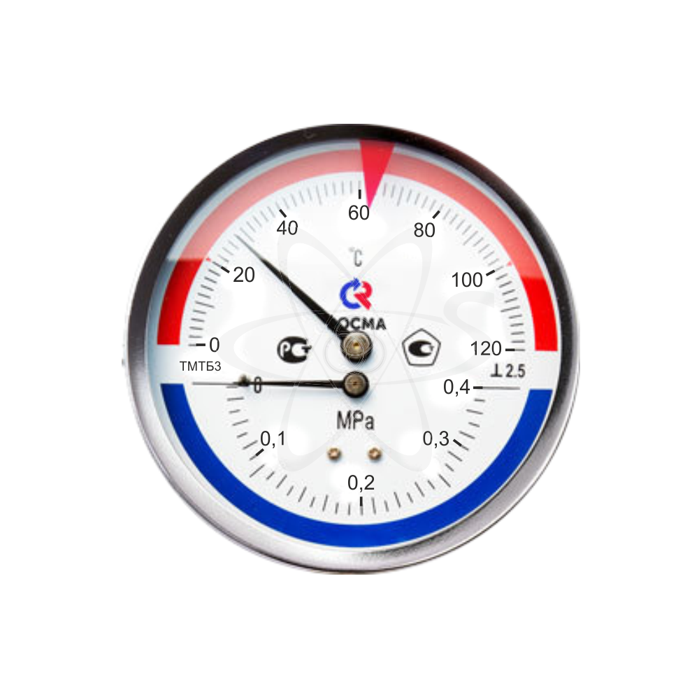 Термоманометр радиальный предназначен для одновременного измерения температуры и избыточного давления неагрессивных к медным сплавам сред. Область применения: системы отопления, водоснабжение, бойлеры, паровые котлы и т.д. Термоманометр — комбинированный прибор, для измерения давления и температуры. Для визуального контроля основных параметров теплоносителя (давления и температуры) как правило, применяют манометр и термометр. Попытка объединить эти два прибора привела к созданию комбинированного прибора, получившего название «термоманометр». Конструктивно термоманометр ТМТБ объединяет деформационный манометр и биметаллический термометр. Термоманометры имеют циферблат с двумя шкалами и две указательных стрелки. Одна шкала служит для отсчета давления, другая — температуры. Компания «РОСМА» выпускает термоманометры двух типоразмеров: диаметром корпуса 80 и 100 мм. По расположению штуцера термоманометры могут быть осевыми и радиальными. Длина погружной части также может варьироваться по заказу потребителя. Все термоманометры комплектуются защитным клапаном.