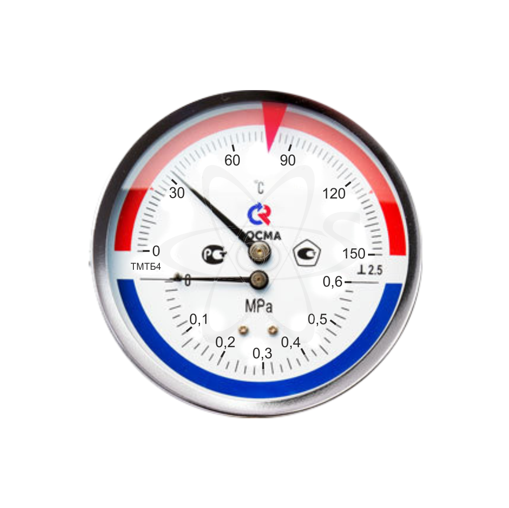 Термоманометр радиальный предназначен для одновременного измерения температуры и избыточного давления неагрессивных к медным сплавам сред. Область применения: системы отопления, водоснабжение, бойлеры, паровые котлы и т.д. Термоманометр — комбинированный прибор, для измерения давления и температуры. Для визуального контроля основных параметров теплоносителя (давления и температуры) как правило, применяют манометр и термометр. Попытка объединить эти два прибора привела к созданию комбинированного прибора, получившего название «термоманометр». Конструктивно термоманометр ТМТБ объединяет деформационный манометр и биметаллический термометр. Термоманометры имеют циферблат с двумя шкалами и две указательных стрелки. Одна шкала служит для отсчета давления, другая — температуры. Компания «РОСМА» выпускает термоманометры двух типоразмеров: диаметром корпуса 80 и 100 мм. По расположению штуцера термоманометры могут быть осевыми и радиальными. Длина погружной части также может варьироваться по заказу потребителя. Все термоманометры комплектуются защитным клапаном.