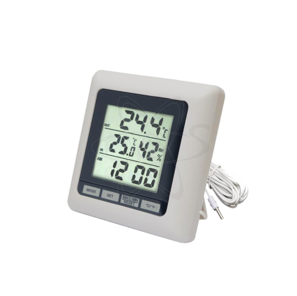 Предназначен для измерения уличной температуры воздуха и комнатной температуры и влажности. Дополнительные функции: часы, будильник. Комнатный диапазон влажности от 30% до 90%. Память минимальных и максимальных значений температуры и влажности. Настенное крепление и настольная подставка, 12-ти часовой формат времени. Длина шнура внешнего датчика - 3м. Переключатель °C/°F на передней панели.