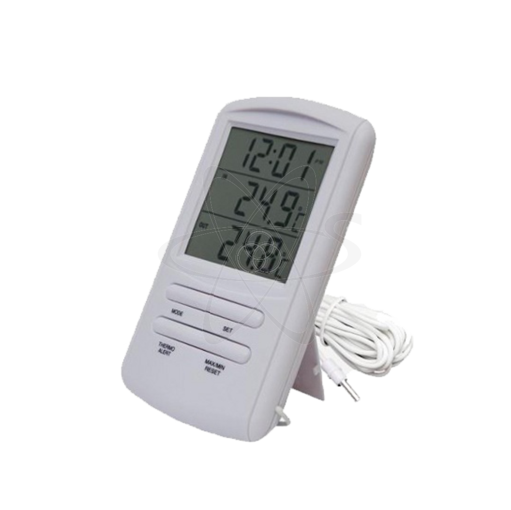 Предназначен для измерения уличной температуры воздуха и комнатной температуры и влажности. Дополнительные функции: часы, будильник. Комнатный диапазон влажности от 30% до 90%. Память минимальных и максимальных значений температуры и влажности. Настенное крепление и настольная подставка, 12-ти часовой формат времени. Длина шнура внешнего датчика - 3м. Переключатель °C/°F на передней панели.