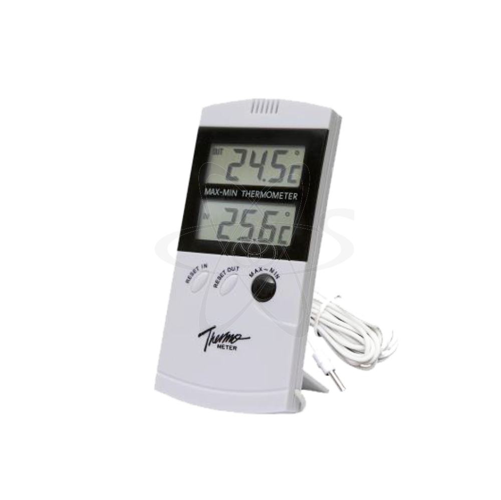 Компактный комнатно-уличный термометр. Память минимальных и максимальных значений температуры. Настенное крепление, настольная подставка. Длина шнура внешнего датчика - 3м. Переключатель °C/°F на задней панели.