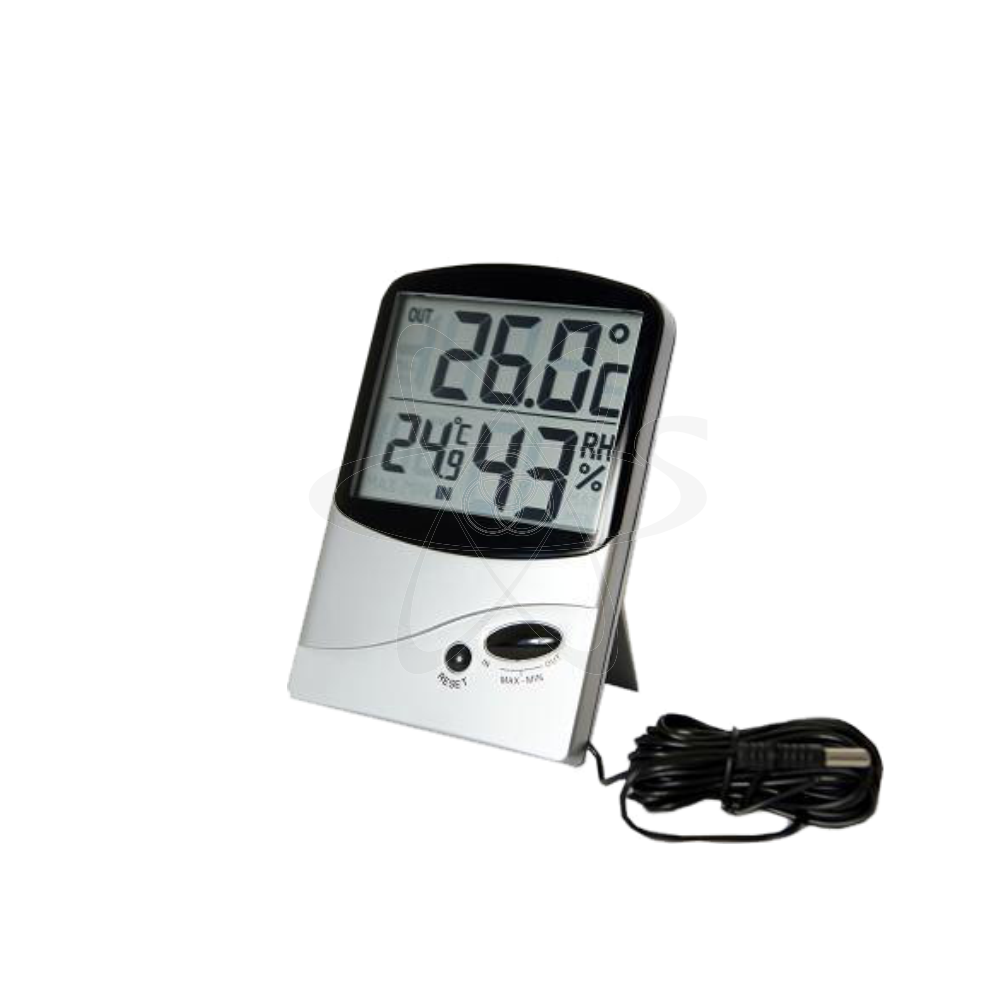Комнатно-уличный термометр с огромным дисплеем (82х64мм). Цвет: серебристый металлик. Комнатный диапазон влажности от 25% до 98%. Память минимальных и максимальных значений температуры и влажности. Настенное крепление, настольная подставка. Длина шнура внешнего датчика - 3м. Переключатель °C/°F на задней панели.