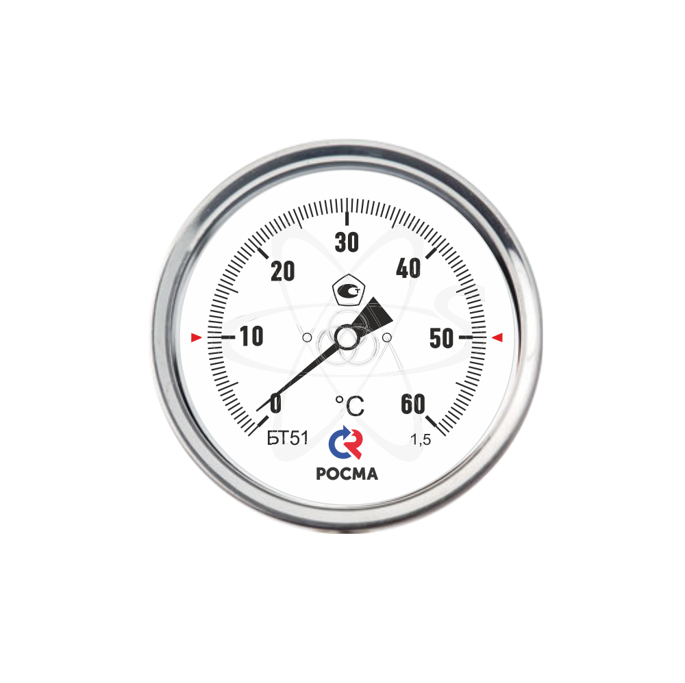 Термометр осевой биметаллический предназначен для измерения температуры жидкостей и газов в отопительных и санитарных установках, в системах кондиционирования и вентиляции. Принцип действия термометров БТ основан на зависимости деформации чувствительного элемента от измеряемой температуры. В качестве чувствительного элемента используется биметаллическая пружина. Биметаллическая пружина изготавливается из двух прочно соединенных металлических пластин, имеющих различные температурные коэффициенты линейного расширения. При изменении температуры пружина изгибается и вращает стрелку термометра. Один конец пружины закреплен внутри штока, а к другому присоединяется ось стрелки. Корпус термометра изготавливается из коррозионностойкой стали, шток — из нержавеющей стали.