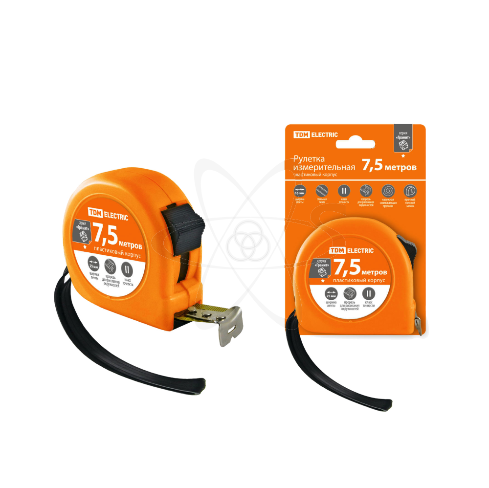 - Рулетка, длина 7.5 м, стальная лента, ширина 25 мм, пластиковый корпус, "Гранит" TDM