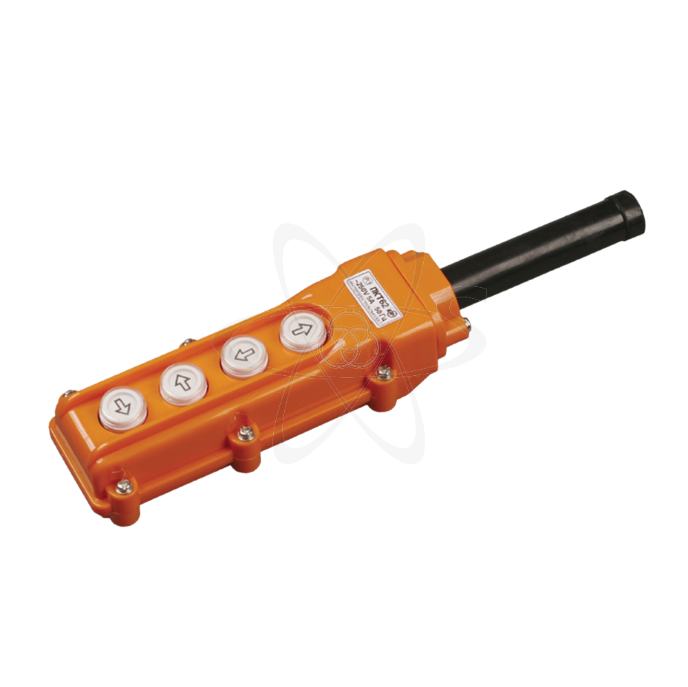 Изделие предназначено для коммутации электрических цепей управления подъемными механизмами. Корпус из термостойкой ABС-пластмассы. Возможность установки 4 или 6 кнопок. Наличие защитного сальника на вводе кабеля, который исключает попадание влаги и пыли внутрь корпуса. Между основанием и крышкой устанавлена герметичная прокладка