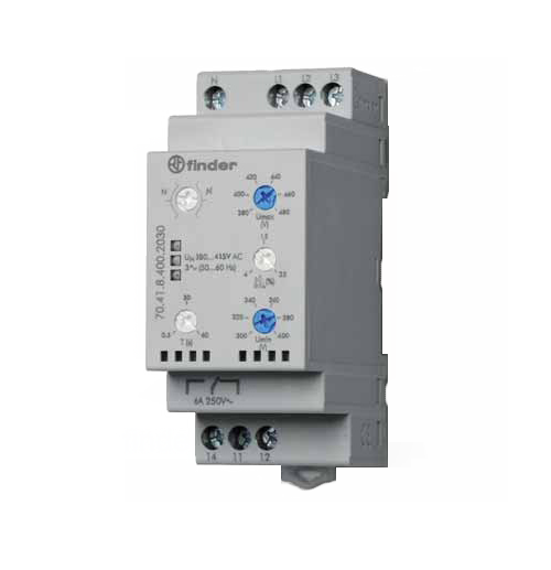 Контрольное реле для 3-фазных сетей; пониженное/повышенное напряжение, обрыв/чередование/асимметрия фаз, контроль нейтрали, настраиваемые диапазоны; выход 1CO 6А; модульное, ширина 35мм; степень защиты IP20