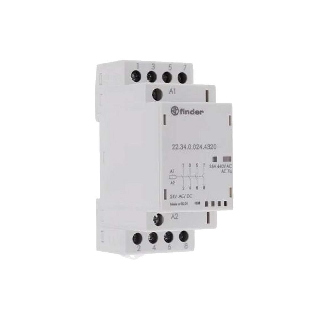 - Модульный контактор; 4NO 25А; контакты AgSnO2; катушка 24В АС/DC; ширина 35мм; мех.индикатор + LED