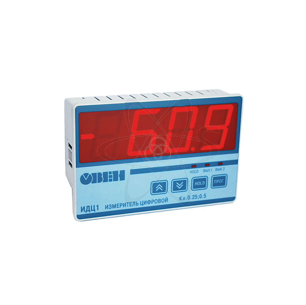 ИДЦ1 - измеритель цифровой,совместно с первичным датчиком предназначен для измерения различных физических величин. Измиритель имеет два встроенных выходных устройства для выдачи сигнализации.В процессе работы прибор предоставляет пользователю возможность фиксации на дисплее текущего значения измеряемой величины и запоминания ее последнего значения в энергозависимой памяти прибора (функция «HOLD»). Прибор большой, с контрастными, хорошо заметными издалека цифрами, на дисплее имеется индикатор знака. Функциональные возможности прибора: измерение температуры или других физических величин (влажности,расхода,давления,уровня и т.п.) при помощи датчиков c унифицированным выходным сигналом напряжения либо тока; формирование сигнализации о выходе (или входе) измеряемого параметра в заданную пользователем зону (U и П – образные логики);функция «HOLD». В ходе работы прибор предоставляет пользователю возможность фиксации на дисплее текущего значения измеряемой величины и запоминания ее энергозависимой памяти прибора. ИДЦ1 имеет крупный 4-х разрядный цифровой индикатор. Размер цифр 40х20мм. масштабирование измеренного значение входного сигнала от 4 до 20 мА. ИДЦ1 имеет съемные клеммники обеспечивающие легкость монтажа и демонтажа прибора.