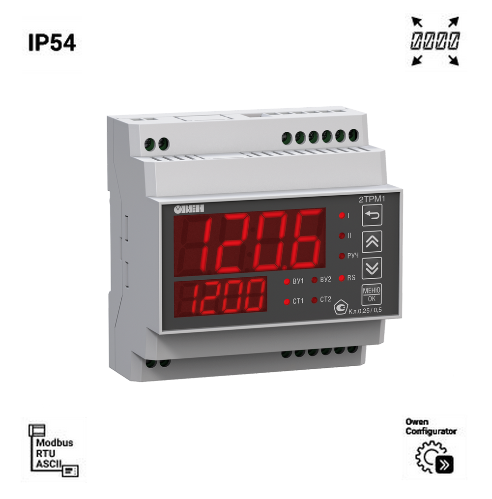 2ТРМ1 – двухканальный цифровой измеритель-регулятор, предназначенный для измерения, регистрации или автоматического регулирования температуры, а также других физических величин (давление, влажность, уровень, расход и т.д.). Отличительной особенностью прибора является наличие двух независимых каналов управления. Прибор осуществляет как независимое управление по двум каналам, так и совместную работу каналов в задачах регулирования и сигнализации. Наличие второго входа позволяет выполнять регулирование по двум величинам с вычислением среднего значения или разницы показаний входов. Двухканальный терморегулятор 2ТРМ1 работает с разными типами датчиков что позволяет одним прибором контролировать две физические величины, например температуру и давление, температуру и влажность, давление и уровень. Наличие RS-485 позволяет выводить все измеряемые и настраиваемые параметры прибора в сеть диспетчеризации предприятия.