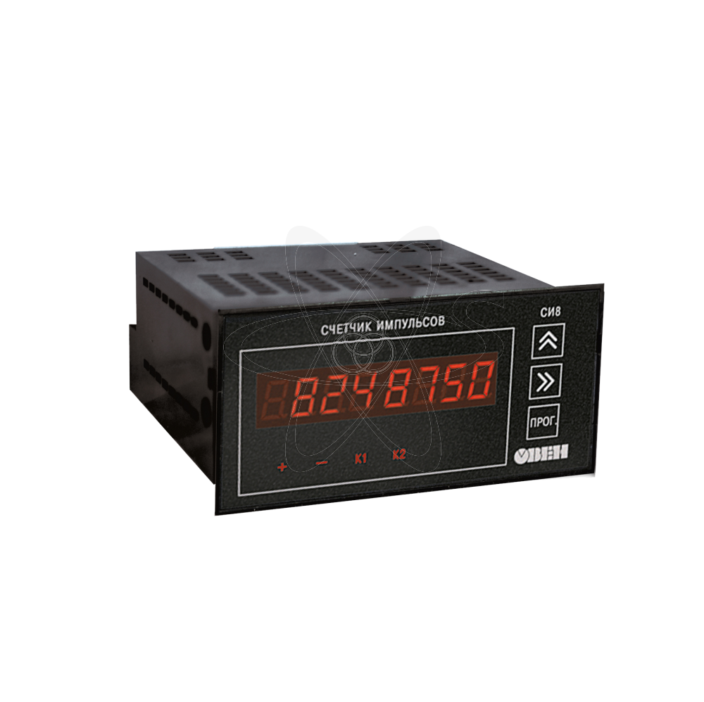 Микропроцессорный счетчик импульсов СИ 8. Используется для подсчета количества продукции на транспортере, длины наматываемого кабеля или экструзионной пленки, сортировки продукции, отсчета партий продукции, суммарного количества изделий и т.п. Встроенный в СИ8 таймер позволяет использовать прибор в качестве счетчика наработки, расходомера или для определения скорости вращения вала. Счетчик импульсов СИ8 не рекомендуется использовать совместно с энкодерами. Для работы с энкодерами следует применять счетчик импульсов ОВЕН СИ30. Функциональные возможности: Прямой, обратный или реверсивный счет импульсов, поступающих от подключенных к прибору датчиков. Определение направления вращательного движения узлов и механизмов. Подсчет текущего или суммарного расхода. Реальные единицы измерения продукции. Подсчет времени наработки оборудования. Измерение длительности процессов. Три внешних входных устройства для организации счета. Управление нагрузкой с помощью двух выходных устройств. Сохранение результатов счета при отключении питания. Встроенный модуль интерфейса RS-485 по желанию заказчика.