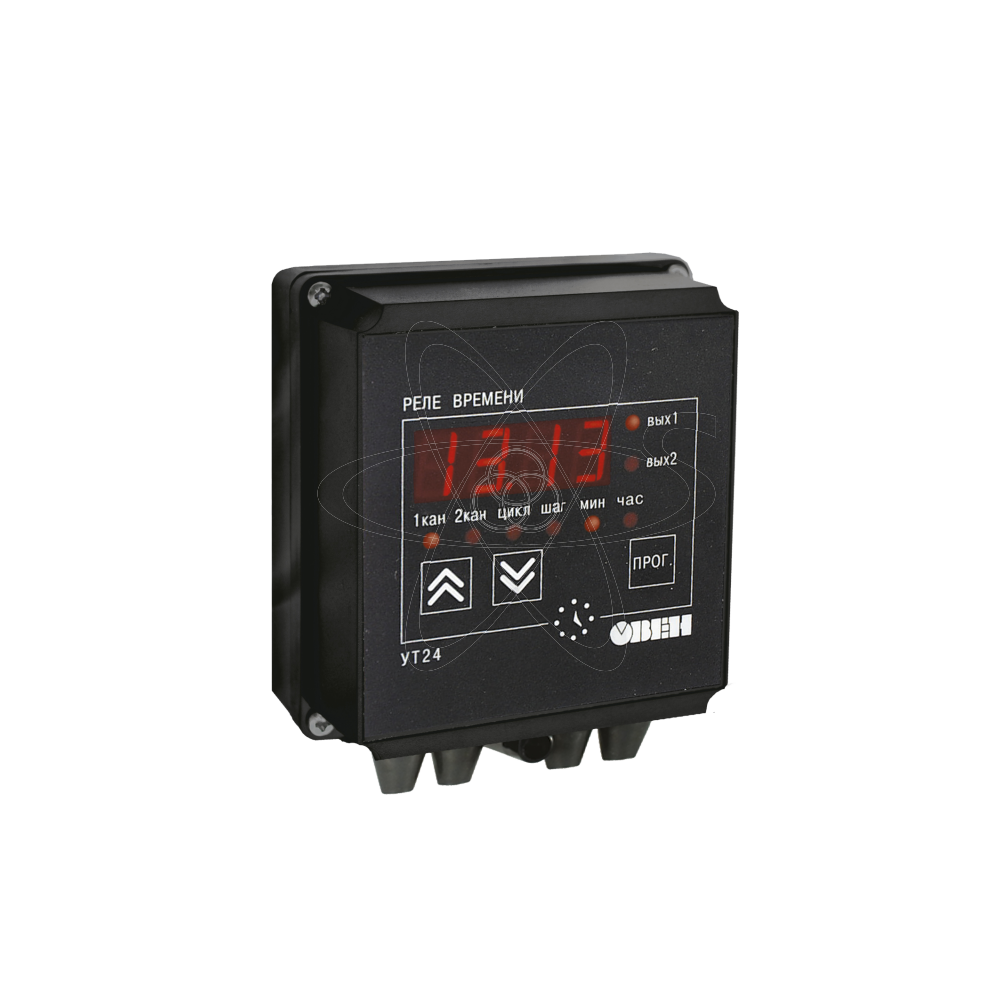 Универсальное двухканальное реле времени УТ24 предназначено для включения и выключения нагрузки по заданной оператором программе. Применяется в качестве таймера, устройства задержки включения или формирователя последовательности импульсов, длительность которых задается пользователем. Функциональные возможности реле времени ОВЕН УТ24: Запуск программы по команде оператора или подаче питания на прибор (без привязки к календарному времени). Два независимых таймера для формирования двух независимых программ управления исполнительными механизмами. Две программы из конечного и бесконечного числа циклов по 1...30 шагов (каждый шаг задает включение/выключение исполнительного механизма).Количество циклов в программе от 1 до 9999 или бесконечно Подключение трех внешних устройств для запуска, остановки, временной блокировки или сброса программы таймера. Индикация времени, числа циклов и шагов, оставшихся до окончания программы. Программирование кнопками на лицевой панели прибора. Сохранение текущих значений и параметров программы при отключении питания. Защита параметров от несанкционированного доступа.