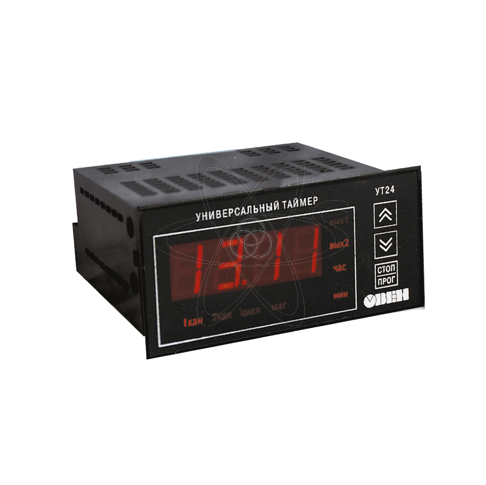Универсальное двухканальное реле времени УТ24 предназначено для включения и выключения нагрузки по заданной оператором программе. Применяется в качестве таймера, устройства задержки включения или формирователя последовательности импульсов, длительность которых задается пользователем. Функциональные возможности реле времени ОВЕН УТ24: Запуск программы по команде оператора или подаче питания на прибор (без привязки к календарному времени). Два независимых таймера для формирования двух независимых программ управления исполнительными механизмами. Две программы из конечного и бесконечного числа циклов по 1...30 шагов (каждый шаг задает включение/выключение исполнительного механизма).Количество циклов в программе от 1 до 9999 или бесконечно Подключение трех внешних устройств для запуска, остановки, временной блокировки или сброса программы таймера. Индикация времени, числа циклов и шагов, оставшихся до окончания программы. Программирование кнопками на лицевой панели прибора. Сохранение текущих значений и параметров программы при отключении питания. Защита параметров от несанкционированного доступа.