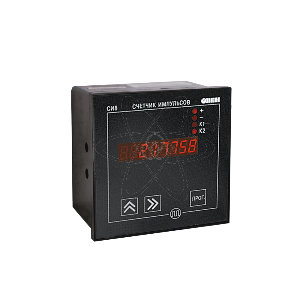 Микропроцессорный счетчик импульсов СИ 8. Используется для подсчета количества продукции на транспортере, длины наматываемого кабеля или экструзионной пленки, сортировки продукции, отсчета партий продукции, суммарного количества изделий и т.п. Встроенный в СИ8 таймер позволяет использовать прибор в качестве счетчика наработки, расходомера или для определения скорости вращения вала. Счетчик импульсов СИ8 не рекомендуется использовать совместно с энкодерами. Для работы с энкодерами следует применять счетчик импульсов ОВЕН СИ30. Функциональные возможности: Прямой, обратный или реверсивный счет импульсов, поступающих от подключенных к прибору датчиков. Определение направления вращательного движения узлов и механизмов. Подсчет текущего или суммарного расхода. Реальные единицы измерения продукции. Подсчет времени наработки оборудования. Измерение длительности процессов. Три внешних входных устройства для организации счета. Управление нагрузкой с помощью двух выходных устройств. Сохранение результатов счета при отключении питания. Встроенный модуль интерфейса RS-485 по желанию заказчика.