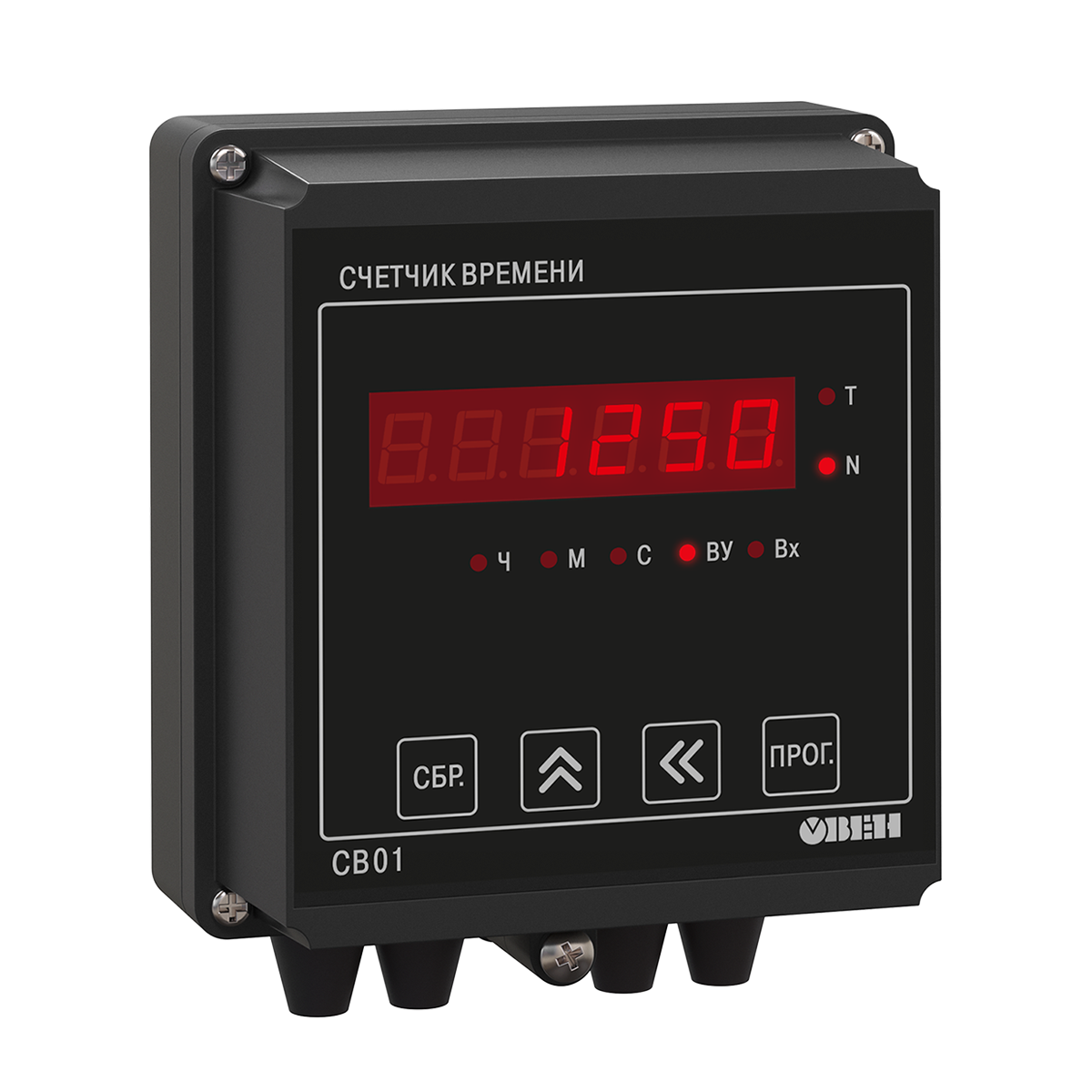 Прибор предназначен для измерения интервалов времени и счета количества измеренных сигналов. Счетчик времени СВ01 может быть использован в составе измерительных систем контроля и управления технологическими процессами на промышленных предприятиях. Он может применяться для автоматического учета времени наработки оборудования (двигателей, станков, автономных электростанций, компрессоров, холодильных установок, спецтехники и др. оборудования), благодаря чему удается измерить общую продолжительность работы оборудования и своевременно производить профилактические и регламентные работы. Функция счетчика времени; функция счетчика количества включений прибора; дискретный вход для подключения активных датчиков, имеющих на выходе транзистор n-p-n-типа с открытым коллектором, либо контактов, кнопок и других датчиков типа «сухой контакт»; ВУ (по заказу) электромагнитное реле; встроенный интерфейс RS-485(по заказу), протокол ОВЕН, Modbus ASCII/RTU; запуск отсчета времени: по подаче напряжения питания на прибор, по внешнему сигналу с дискретного входа.