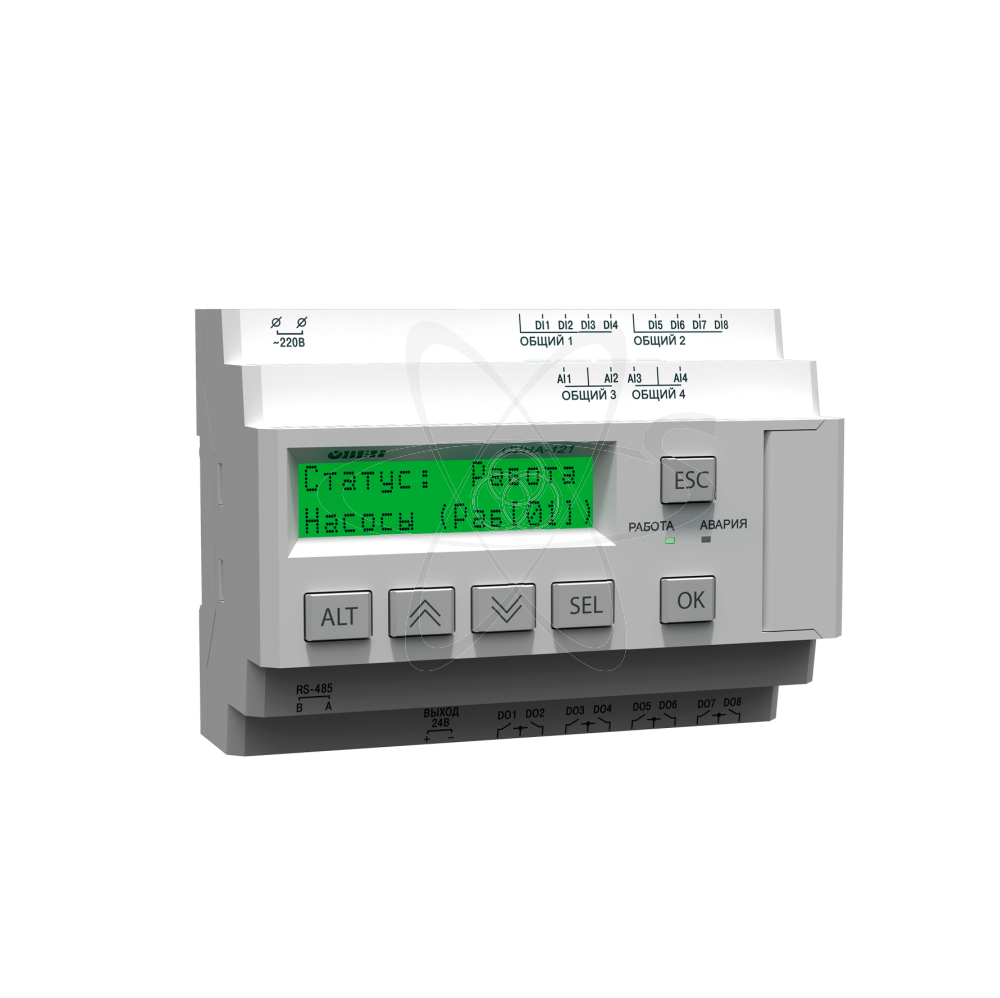 Контроллер ОВЕН СУНА-121 предназначен для управления насосными группами в системах водоснабжения, водозабора, повышения давления, канализационных сооружений жилых и офисных зданий, промышленных предприятий, коттеджных посёлков, детских садов, школ, больниц и других объектов. СУНА-121 выпускается в 8-ми модификациях и позволяет реализовать следующие алгоритмы управления насосными группами: Чередование 2-х насосов. Чередование 3-х насосов. Регулирование давления, 2 насоса, по реле давления. Регулирование давления, 2 насоса, по аналоговому датчику давления. Регулирование давления, 3 насоса, по аналоговому датчику давления. Заполнение/опорожнение резервуара, 2 насоса, дискретные датчики уровня. Заполнение/опорожнение резервуара, 2 насоса, аналоговые датчики уровня. Заполнение/опорожнение резервуара, 3 насоса, аналоговые датчики уровня. Функциональные преимущества: Возможность дистанционного управления насосами по RS-485. Возможность смены алгоритма управления. Интуитивно-понятное русскоязычное меню. Индикация на ЖК дисплее с подсветкой. Модификации с питанием от сети ~230 В и =24 В. Температура эксплуатации: -20…+55 °С. Описание алгоритма: Управление насосной станцией из двух насосов одного типоразмера. Регулирование давления на выходе насосной станции обеспечивается включением/отключением необходимого количества насосов по сигналам от дискретных датчиков выходного давления.