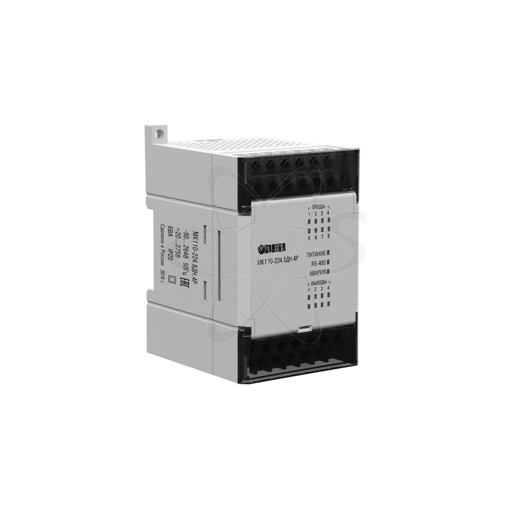 Прибор предназначен для управления по сигналам из сети RS-485 встроенными дискретными ВЭ, используемыми для подключения исполнительных механизмов с дискретным управлением, и сбора данных с дискретных входов модуля с передачей их в сеть RS-485. Встроенные ВЭ могут работать в режиме ШИМ, дискретные входы могут работать в режиме счетчиков импульсов частотой до 1 кГц. МК110 работает в сети RS-485 по протоколам ОВЕН, ModBus-RTU, ModBus-ASCII, DCON. МК110 не является Мастером сети, поэтому сеть RS-485 должна иметь Мастер сети, например, ПК с запущенной на нем SCADA-системой, контроллер или регулятор. К МК110 предоставляется бесплатный ОРС-драйвер и библиотека стандарта WIN DLL, которые рекомендуется использовать при подключении прибора к SCADA-системам и контроллерам других производителей. Конфигурирование МК110 осуществляется на ПК через адаптер интерфейса RS-485/RS-232 или RS-485/USB (например ОВЕН АСЗ-М или АС4) с помощью программы «Конфигуратор М110», входящей в комплект поставки. Прибор отвечает требованиям по устойчивости к воздействию помех в соответствии с ГОСТ Р 51522 для оборудования класса А. Основные особенности модуля ввода-вывода дискретных сигналов МК110-8ДН.4Р: 8 каналов дискретного ввода, групповая изоляция. Типы входных сигналов: сигналы =24 В, транзисторные ключи p-n-p, n-p-n типа. Частота измерений: до 1 кГц, минимальная длительность импульса 0.5 мс. Счетчик импульсов для каждого канала. =4 канала дискретного вывода. Типы выходных элементов: Р – э/м реле 4 А ~250 В или =24 В; =Возможность выдачи ШИМ-сигнала с любого выхода. Напряжение питания*: ~220 В и =24 В (универсальный источник питания).