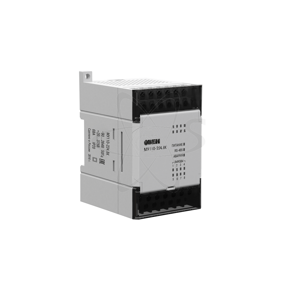 Прибор предназначен для управления по сигналам из сети RS-485 встроенными дискретными ВЭ, используемыми для подключения исполнительных механизмов с дискретным управлением. Встроенные ВЭ могут работать в режиме ШИМ. МУ110 работает в сети RS-485 по протоколам ОВЕН, ModBus-RTU, ModBus-ASCII, DCON. МУ110 не является Мастером сети, поэтому сеть RS-485 должна иметь Мастер сети, например, ПК с запущенной на нем SCADA-системой, контроллер или регулятор. К МУ110 предоставляется бесплатный ОРС-драйвер и библиотека стандарта WIN DLL, которые рекомендуется использовать при подключении прибора к SCADA-системам и контроллерам других производителей. Конфигурирование МУ110 осуществляется на ПК через адаптер интерфейса RS-485/RS-232 или RS-485/USB (например ОВЕН АСЗ-М или АС4) с помощью программы «Конфигуратор М110», входящей в комплект поставки. Прибор отвечает требованиям по устойчивости к воздействию помех в соответствии с ГОСТ Р 51522 для оборудования класса А. Основные особенности модуля дискретного вывода ОВЕН МУ110-8К: 8 каналов дискретного вывода. Типы выходных элементов: К – транзисторная оптопара, открытый коллектор, групповая развязка, 400мА, =60 В. Возможность выдачи ШИМ-сигнала с любого выхода. Напряжение питания*: ~220 В и =24 В (универсальный источник питания).