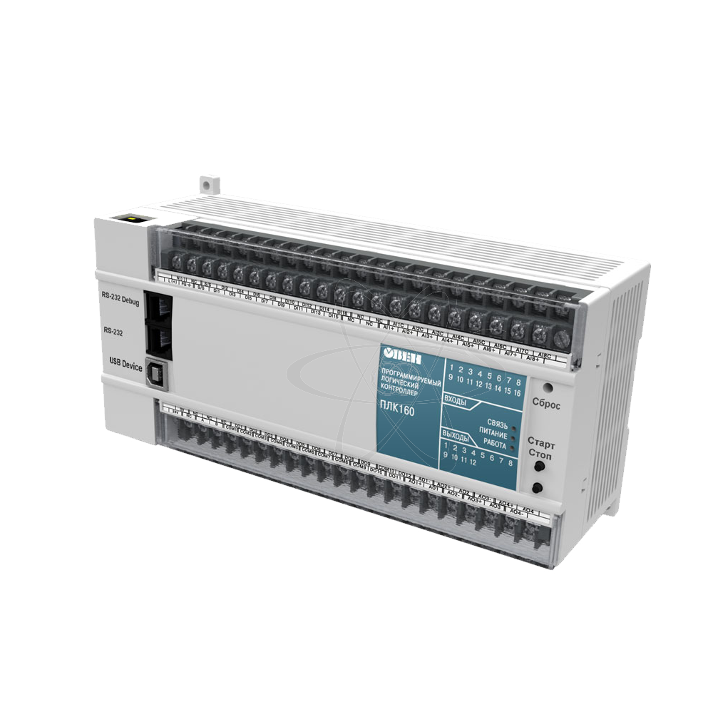 ОВЕН ПЛК160 – линейка программируемых моноблочных контроллеров с дискретными и аналоговыми входами/выходами на борту для автоматизации средних систем. Оптимальны для построения систем автоматизации среднего уровня и распределенных систем управления. Рекомендуется к использованию: В системах HVAC. В сфере ЖКХ (ИТП, ЦТП). В АСУ водоканалов (водоподготовка, насосные станции). Для управления пищеперерабатывающими и упаковочными аппаратами. Для управления климатическим оборудованием. В сфере производства строительных материалов. Отличительные особенности линейки: Мощные вычислительные ресурсы и большой объем памяти. Наличие дискретных и аналоговых входов/выходов на борту контроллера. Наличие последовательных портов (RS-232, RS-485) на борту контроллера. Наличие порта Ethernet для включения в локальные или глобальные сети верхнего уровня. Поддержка протоколов обмена Modbus (RTU, ASCII), ОВЕН, DCON. Возможность работы напрямую с портами контроллера, что позволяет подключать внешние устройства с нестандартными протоколами. Контроллер имеет встроенные часы, что позволяет создавать системы управления с учетом реального времени. Встроенный аккумулятор, позволяющий организовать ряд дополнительных сервисных функций: возможность кратковременного пережидания пропадания питания, перевод выходных элементов в безопасное состояние. Аналоговые выходы могут быть: По току 4...20 мА. По напряжению 0...10 В. Универсальные - программно переключаемые ток\напряжение. Все контроллеры данной линейки имеют большое количество интерфейсов на борту, работающих независимо друг от друга: Ethernet; До трех последовательных портов; USB Device для программирования контроллера. Контроллеры данной линейки также поддерживают работу с нестандартными протоколами по любому из портов, что позволяет подключать такие устройства, как электро-, газо-, водосчетчики, считыватели штрих-кодов и т.п. Программирование контроллеров осуществляется в профессиональной, распространенной среде CODESYS v.2.3.x, максимально соответствующей стандарту МЭК 61131: поддержка 5 языков программирования, для специалистов любой отрасли; мощное средство разработки и отладки комплексных проектов автоматизации на базе контроллеров; функции документирования проектов; количество логических операций ограничивается только количеством свободной памяти контроллера; практически неограниченное количество используемых в проекте счетчиков, триггеров, генераторов. Интерфейсы для программирования и отладки: Ethernet, USB, RS-232 (Debug).