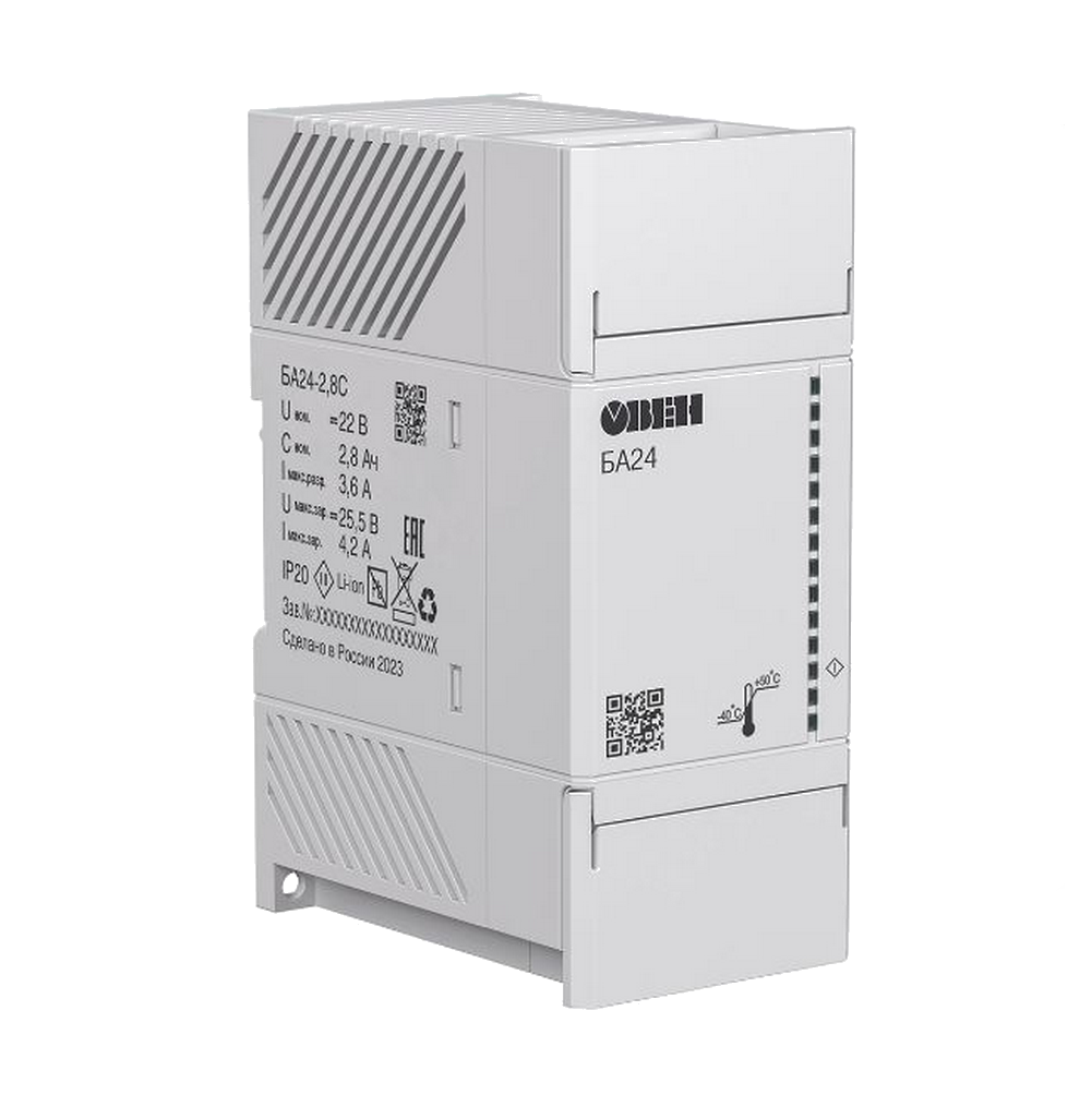 Блоки аккумуляторные для ИБП БА24 и БА12 со встроенным Li-on-аккумуляторными батареями предназначены для обеспечения резервного питания элементов автоматизированной системы управления технологическим процессом, а также прочих изделий и систем в промышленности. БА24 и БА12 являются частью «Экосистемы-210» компании ОВЕН и рекомендуется для совместного применения с ИБП.