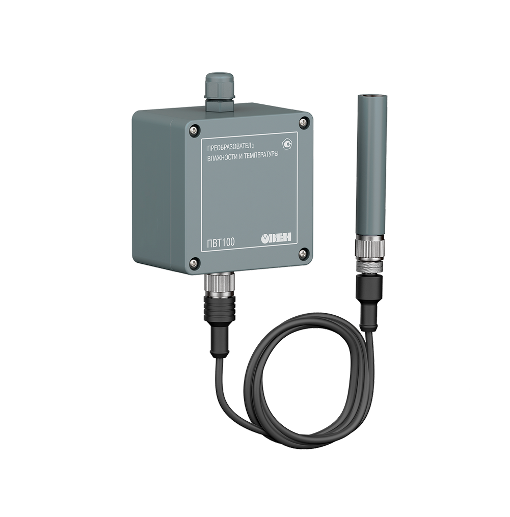 Промышленный датчик влажности и температуры ОВЕН ПВТ100 предназначен для непрерывного преобразования относительной влажности и температуры неагрессивного газа в два унифицированных выходных сигнала: аналоговый 4…20 мА и цифровой Modbus RTU по интерфейсу RS-485.