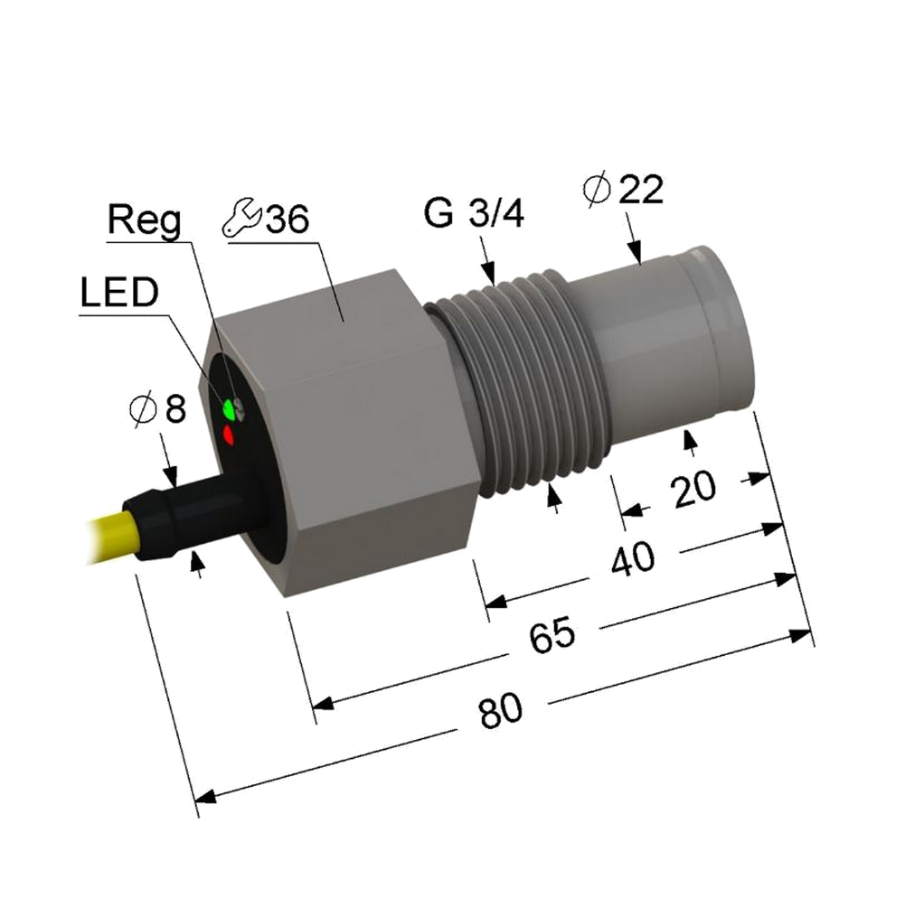 Цилиндрический корпус из ПФС с трубной резьбой G3/4" для встраивания в емкость с жидкостью, длиной 80 мм с удлиненным штуцером для надевания защитной трубки.