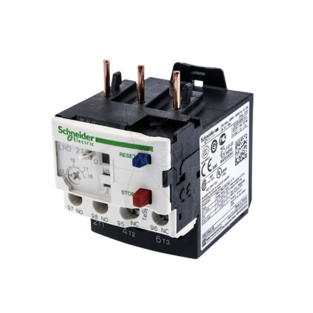 Тепловое реле перегрузки предназначено для защиты электродвигателей. Защита цепей переменного тока и электродвигателей от перегрузки, обрыва фаз, затянутого времени пуска, продолжительного заклинивания ротора. Постоянный контроль тока, потребляемого электродвигателем. Изменение положения контактов вспомогательных теплового реле при превышении током установленного значения(уставки). Размыкание НЗ-контактом реле цепи катушки упарвления контактора. Отключение контактора и остановка электродвигателя. Уставка срабатывания: 1.14±0.06 x Ir, где Ir - тепловой ток. Чувствительность к обрыву фазы - реле срабатывает, если ток в 2-х фазая составляет 130% от Ir, а в 3-й фазе равен 0. На передней панели теплового реле расположены: поворотный диск регулировки уставки теплового тока Ir, кнопка TEST для контроля кабельных соединений цепи упарвления и имитации срабатывания реле (воздействует на оба дополнительных контакта 1НО+1НЗ), кнопка STOP (изменяет состояние 1НО-контакта, не влияет на 1НЗ-контакт), кнопка RESET для возрата реле в рабочее состояние при ручном сбросе, индикатор срабатывания реле, ломбируемая крышка для защиты диска токовых уставок, переключатель выбора режимов ручного или автоматического возврата.