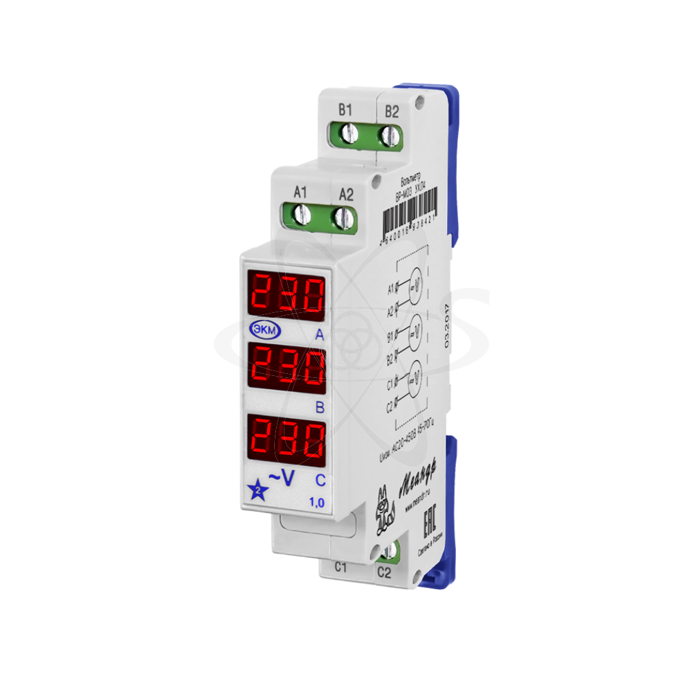 ВР-М03 (далее-вольтметр) предназначен для контроля величины напряжения в силовых электрических цепях переменного тока, как сферах ЖКХ так и в промышленных зонах, , бытовом секторе, прочих объектах народного хозяйства. Такжне применяется в составе систем автоматизированного контроля и управления технологическими процессами в качестве дополнительного или основного индикатора на стационарных и передвижных объектах. Является средством контроля. Периодической поверке не подлежит. Вольтметр выпускаются в унифицированном пластмассовом корпусе модульного исполнения с передним присоединением проводов питания и коммутируемых электрических цепей. Монтаж осуществляется на рейку-DIN шириной 35 мм (ГОСТ Р МЭК 60715 - 2003) или на монтажную панель. Для установки вольтметра на монтажную панель пружины замков необходимо раздвинуть. Клемная конструкция обеспечивает надёжный зажим проводов сечением до 2,5мм2. На передней панели приборов расположен цифровой индикатор отображающий величину напряжения питания,кнопка считывания информации и сброса показаний. Индикатор имеет ярко-красную подсветку, обеспечивающую считывание информации при любой освещённости.