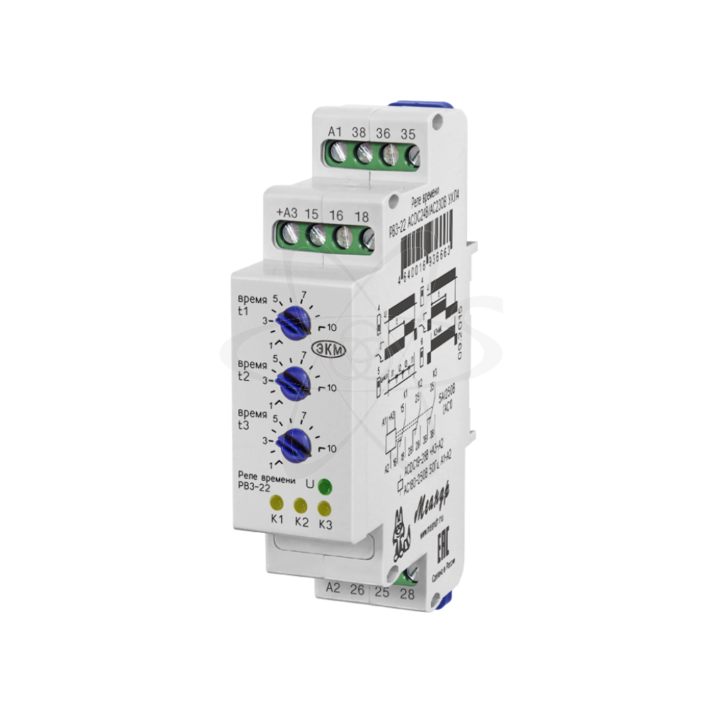 РВ3-22 (далее-реле) реле времени с выдержкой в каждой из трех цепей, предназначено для коммутации электрических цепей - К1, К2, К3 с уставками по времени t1, t2 и t3. В схемах автоматики является комплектующим изделием. Реле используется в взамен реле ВЛ-56, ВС-43 и прочих. Реле выпускаются в унифицированном пластмассовом корпусе модульного исполнения с передним присоединением проводов питания и коммутируемых электрических цепей. Крепление осуществляется на монтажную рейку-DIN шириной 35мм (ГОСТ Р МЭК 60715-2003) или на ровную поверхность. Для установки реле на ровную поверхность замки необходимо раздвинуть. Конструкция клемм обеспечивает надёжный зажим проводов сечением до 2,5мм2. На лицевой панели реле расположены: три поворотных переключателей установки выдержки времени «время t1», «время t2», «время t3», зелёный индикатор включения напряжения питания «U», три жёлтых индикатора срабатывания встроенных реле «К1», «К2», «К3». На боковой поверхности находятся DIP-переключатели для выбора диаграммы работы и временных диапазонов. Реле имеет 8 поддиапазонов выдержки времени для каждой цепи. Диаграмма работы и временной диапазон выбирается с помощью DIP-переключателей, расположенных на боковой поверхности реле. Требуемые временные выдержки t1, t2, и t3 выставляются соответствующими поворотными переключателями в выбранном диапазоне времени. При выключенных встроенных реле замкнуты контакты (15-16 для К1), (25-26 для К2) и (35-36 для К3). При включённых встроенных реле замкнуты контакты (15-18 для К1), (25-28 для К2) и (35-38 для К3) при этом горят соответствующие индикаторы. Цепь К3 можно перевести в режим мгновенного контакта.