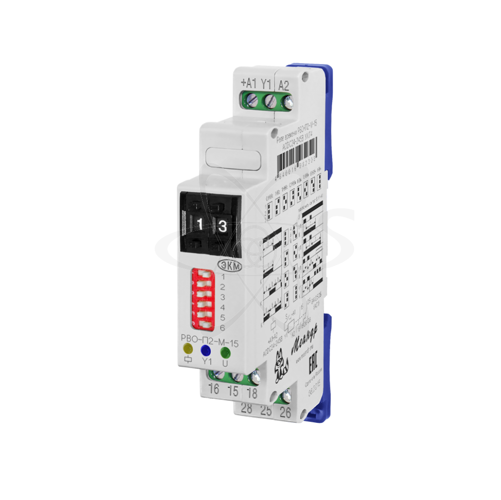 РВО-П2-М-15 (далее-реле) реле времени предназначено для выдачи команд в цепи схем управления через контакты реле после отработки установленной выдержки времени по заданному алгоритму работы. Реле применяется в системах автоматики, как комплектующие изделие. РВО-П2-М-15 выпускаются в унифицированном пластмассовом корпусе модульного исполнения с передним присоединением проводов питания и коммутируемых электрических цепей. Монтаж осуществляется на рейку - DIN шириной 35мм (ГОСТ Р МЭК 60715 - 2003) или на монтажную панель. Для установки реле на монтажную панель, фиксаторы замков необходимо раздвинуть. Клемная конструкция обеспечивает надёжный зажим проводов сечением до 2,5мм2. На передней панели реле расположены: два кнопочных переключателя уставки выдержки времени (t) «десятки» и «единицы», DIP-переключатель для выбора диаграммы работы и временных поддиапазонов, зелёный светодиод включения питания «U», синий светодиод «Y1» наличия сигнала внешнего запуска, жёлтый светодиод срабатывания встроенного исполнительного реле. Реле имеет 8 диапазонов выдержки времени. Соответствующий диапазон устанавливается при помощи DIP-переключателей 1, 2, 3. Время выдержки определяется, как значение установленное на кнопочных переключателях «десятки» и «единицы» и умноженное на коэффициент определяемый положением DIP-переключателей. Диаграмма работы выбирается с помощью DIP-переключателей 4, 5, 6. При включении исполнительного реле, горит жёлтый светодиод и контакты реле 15-18, 25-28 замкнуты . При отключении исполнительного реле жёлтый светодиод гаснет и контакты 15-16, 25-26 замыкаются . При отсчёте установленной выдержки времени светодиод питания «U» загорается периодически. Сигнал внешнего запуска формируется путём замыкания сухого контакта "S" между клеммами «+А1» и «Y1», при наличии сигнала внешнего запуска загорается синий светодиод. Напряжение питания подаётся на клеммы «+А1» и «А2». При питании постоянным током «+U» всегда подключается на клемму «+А1».