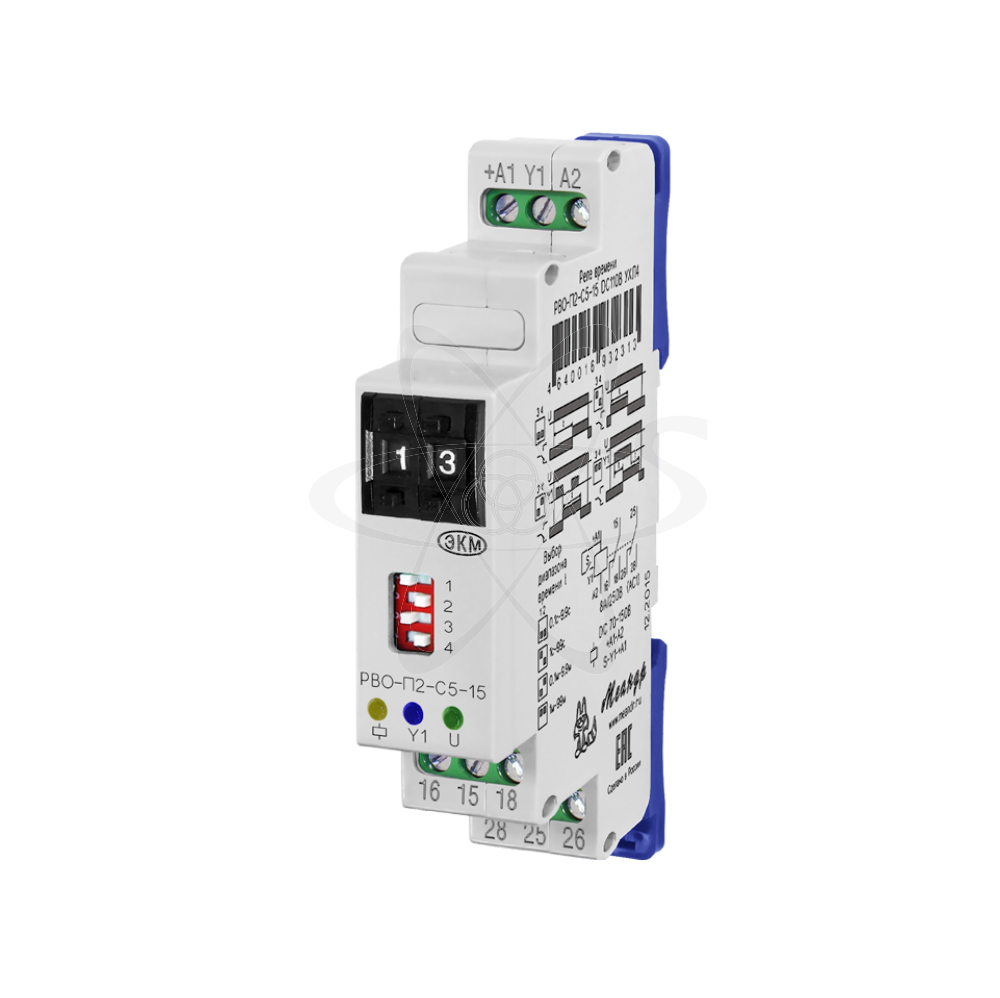РВО-П2-С5-15 (далее-реле) реле времени предназначено для выдачи команд в цепи схем управления через контакты реле в соответствии с выбранной диаграммой работы после отработки предварительно установленной выдержки времени. Реле используется в системах автоматики, как комплектующее изделие. РВО-П2-С5-15 выпускаются в унифицированном пластмассовом корпусе модульного исполнения с передним присоединением проводов питания и коммутируемых электрических цепей. Монтаж осуществляется на рейку - DIN шириной 35 мм (ГОСТ Р МЭК 60715 - 2003) или на онтажную панель. Для установки реле на монтажную панель, фиксаторы замков необходимо раздвинуть. Клемная конструкция обеспечивает надёжный зажим проводов сечением до 2,5мм2. На передней панели реле расположены: два кнопочных переключателя (десятки 0-9 и единицы 0-9) для установки выдержки времени (t), декадный переключатель для выбора диаграммы работы и временных диапазонов, зелёный светодиод включения напряжения питания «U», жёлтый светодиод включения встроенного исполнительного реле. Реле имеет пять диаграмм работы, которые выбираются при помощи поворотного DIP-переключателя. Напряжение внешнего управляющего воздействия должно быть равно напряжению питания. Сигнал внешнего запуска формируется переключателем «S» путём замыкания и размыкания клемм «Y1» и «+А1». Во время «импульса» горит жёлтый светодиод и контакты 15-18, 25-28 замкнуты (встроенное исполнительное реле включено). Во время «паузы» контакты 15-16, 25-26 замкнуты (встроенное исполнительное реле выключено). Напряжение питания DC110 В подаётся на клеммы «+А1» и «А2».