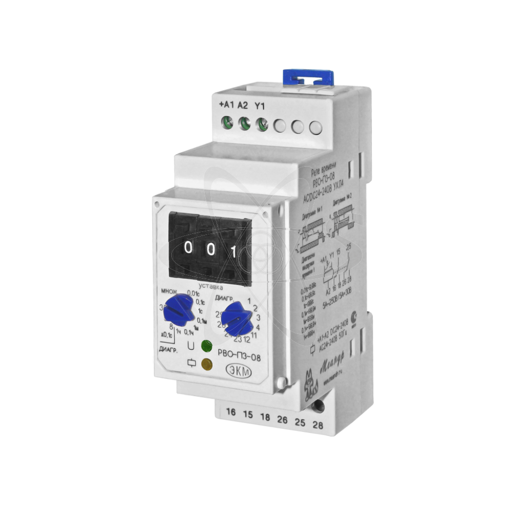 РВО-П3-08 и РВО-П3-081 (далее-реле) реле времени предназначены для коммутации электрических цепей с предварительно установленной выдержкой времени и алгоритмом работы.Реле выпускаются в унифицированном пластмассовом корпусе модульного исполнения с передним присоединением проводов питания и коммутируемых электрических цепей. Монтаж осуществляется на рейку-DIN шириной 35 мм (ГОСТ Р МЭК 60715-2003) или на монтажную панель. Для установки реле на монтажную панель, фиксаторы замков необходимо раздвинуть. Клемная конструкция обеспечивает надёжный зажим проводов сечением до 2,5мм2., а так же возможность пломбирования крышки корпуса. Крышка для опломбировки не входит в компллект и поставляется отдельно по желанию клиента. Наличие пломбировочной крышки увеличивает степень защиты от воздействия статического электричества и позволяет исключить несанкционированный доступ к органам управления выдержкой времени. На передней панели реле расположены: три нажимных переключателя установки выдержки времени t (установка значений единиц 0-9, десятков 0-9 и сотен 0-9), поворотный переключатель множитель для выбора временного диапазона, поворотный переключатель «диагр.» для выбора диаграммы работы, зелёный светодиод наличия напряжения питания «U», жёлтый светодиод срабатывания встроенного исполнительного реле. Реле имеет 7 диапазонов выдержки времени. Требуемая временная выдержка t определяется путём умножения числового значения, установленного на переключателях «cотни», «десятки» и «единицы» на множитель, который определяется положением указателя переключателя «множ.». Переключатель «множ.» имеет три дополнительных положения: - «8» реле работает по диаграмме №8 время t паузы и импульса равны и определяются путём умножения числового значения, установленного на переключателях «сотни», «десятки» и «единицы» на 0,1с; - «9» реле работает по диаграмме №9 время t паузы и импульса равны и определяются путём умножения числового значения, установленного на переключателях «сотни», «десятки» и «единицы» на 0,1с; - «30» реле работает по диаграмме №30 время t и определяются путём умножения числового значения, установленного на переключателях «сотни», «десятки» и «единицы» на 0,1с. Диаграмма работы реле выбирается при помощи переключателя «диагр.». Декадный переключатель имеет десять положений «1»-«2»-«3»-«4»-«11»-«12»-«22»-«23»-«28»-«29». Положение указателя переключателя определяет номер диаграммы работы реле. Если переключатель «множ.» установлен в одно из трѐх положений «8», «9» или «30», то переключатель «диагр.» отключѐн и может находится в любом из положений. В отключенном состоянии контакты 15-16, 25-26 и 31-32 замкнуты (для реле РВО-П3-081). После подачи питания загорается зелёный светодиод «U». Реле начинает раоту по выбранной диаграмме, во время отсчёта выдержки времени зелёный светодиод «U» включается попеременно. При включении исполнительного реле загорается жёлтый светодиод при этом контакты 15-18, 25-28 и 31-34 замыкаются (для реле РВО-П3-081). Изменение диаграммы работы и множителей возможна только после отключения напряжения питания. Значения на переключателях «сотни», «десятки» и «единицы», можно изменять при поданном питании на реле. Напряжение питания подаётся на клеммы «+А1» и «А2». При подключении реле в цепь с постоянным напряжением питания плюсовой провод подключае