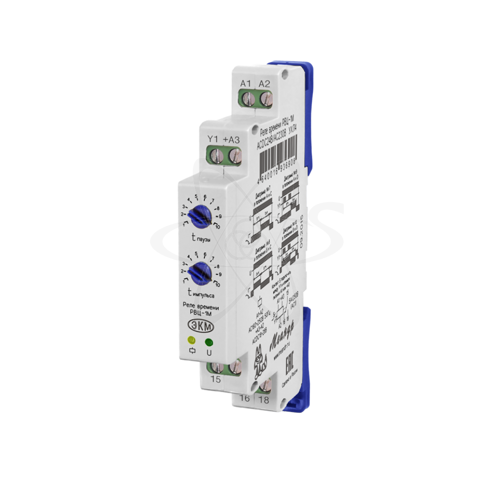 РВЦ-1М (далее-реле) циклическое реле времени предназначено для коммутации электрических цепей в циклическом режиме работы с предварительно установленными выдержками времени (паузы и импульса). Реле выпускаются в унифицированном пластмассовом корпусе модульного исполнения с передним присоединением проводов питания и коммутируемых электрических цепей. Монтаж реле осуществляется на рейку-DIN шириной 35 мм (ГОСТ Р МЭК 60715-2003) или на монтажную панель. Для установки РВЦ-1М на монтажную панель замки необходимо раздвинуть. Клемная конструкция обеспечивает надёжный зажим проводов сечением до 2,5мм2. На передней панели реле расположены: декадный переключатель установки выдержки времени паузы «tпаузы», декадный переключатель установки выдержки времени импульса «tимпульса», жёлтый светодиод срабатывания встроенного реле, зелёный светодиод включения напряжения питания «U». На боковой поверхности расположен DIP-переключатель для выбора диапазона времени паузы (1, 2, 3 переключатели), диапазона времени импульса (4, 5, 6 переключатели) и диаграммы работы (7, 8 переключатели). Реле имеет 8 поддиапазонов выдержки времени паузы и 8 поддиапазонов выдержки времени импульса. Требуемая выдержка паузы (tп) устанавливается поворотным переключателем «tпаузы» в пересчёте на временной диапазон выбранный DIP- переключателем. Требуемая выдержка импульса (tи) устанавливается поворотным переключателем «tимпульса» в пересчёте на временной диапазон выбранный DIP-переключателем. Диаграмма работы реле устанавливается с помощью DIP-переключателя.