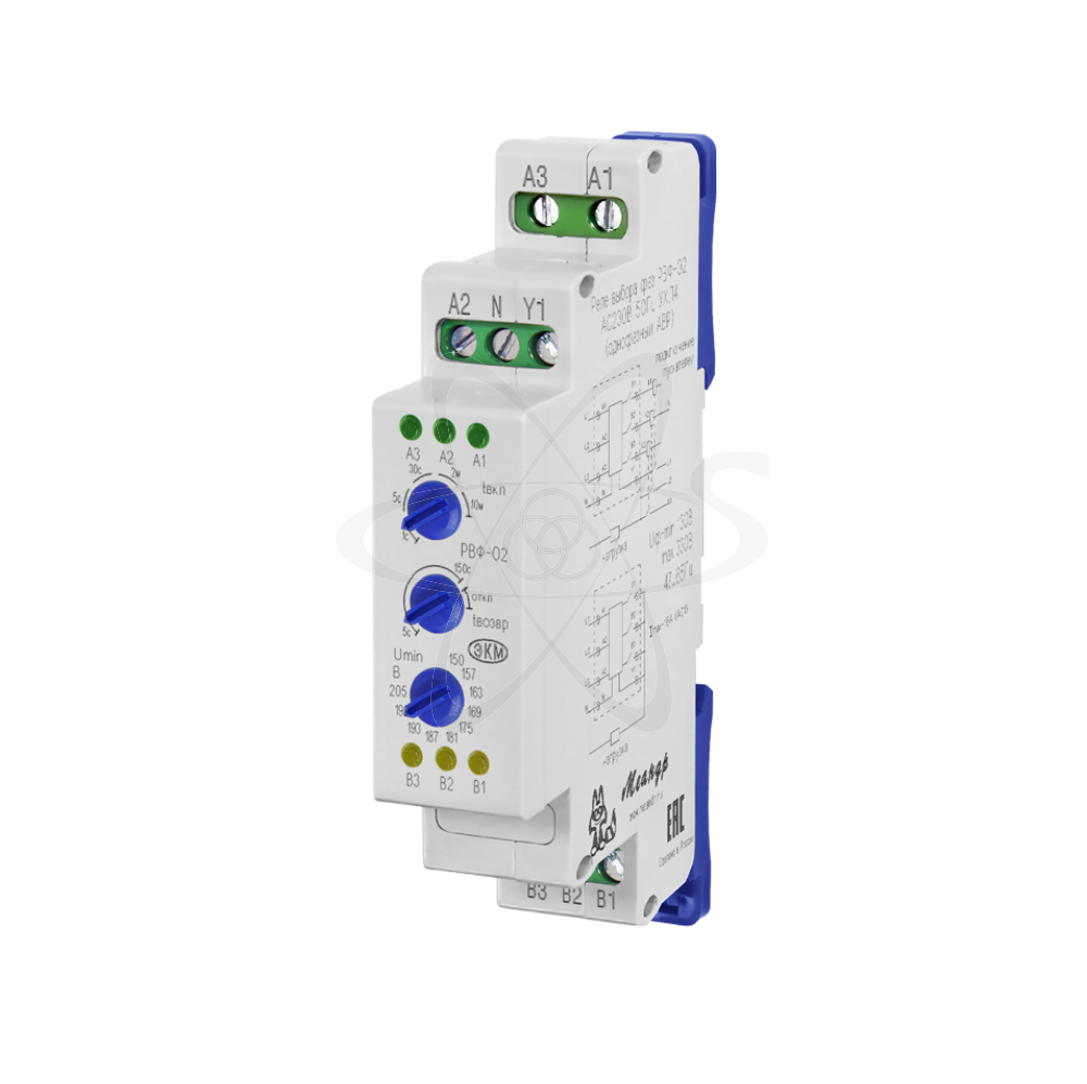 РВФ-02 (дале-реле) реле выбора фаз - это однофазный блок автоматического ввода резерва - АВР и подключается, как правило, к трёхфазной питающей сети обеспечивая переключение однофазных потребителей на лучшую по параметрам фазу питания .. АВР обеспечивает контроль наличия и качества напряжения на фазах и, в зависимости от параметров трех фаз, автоматически выберает наиболее стабильную фазу и с быстродействием (0,1сек) переключает питание однофазной нагрузки на эту фазу. Воизбежании межфазных замыканий, АВР проверяет отключение аварийной фазы, и только потом, включает резервную. В случае залипания контактов реле или контактора, АВР не переключает на более качесвенную фазу, даже при выходе напряжения в этой фазе за установленные пределы предохраняя от межфазного замыкания. РВФ-02 - без функции контроля состояния внешних контакторов (обрыв обмотки, выгорание контактов и т.д.). Реле с функцией контроля состояния внешних контакторов (обрыв обмотки, выгорание контактов и т.д.). АВР может работать с 2-мя или 3-мя независимыми источниками однофазного напряжения, частотой от 45 до 65 Гц и в качестве дополнительной фазы могут использоваться электрогенераторы. РВФ-02 устанавливается в сетях с нестабильным напряжением для питания систем видеонаблюдения,охранно-пожарной сигнализации, санкционированного доступа, производственного и технологического и прочего однофазного оборудования с непрерывным циклом работы. Реле так же имеет функцию возврата на приоритетную фазу после переключения на резервную, т.е. возврата питания нагрузки от приоритетной фазы после восстановления напряжения. Реле выпускаются в унифицированном пластмассовом корпусе модульного исполнения с передним присоединением проводов питания и коммутируемых электрических цепей. Монтаж производится на DIN-рейку шириной 35мм или на монтажную панель.. Для установки реле на монтажную панель, фиксаторы замков необходимо раздвинуть. Клемная конструкция обеспечивает надежный контакт проводов сечением до 2,5 мм2. На передней панели прибора расположены: три зелёных светодиода наличия напряжения фаз «А1», «А2» и «А3», три жёлтых светодиода срабатывания встроенных исполнительных реле «В1»,«В2» и «В3», регулятор времени включения реле «tвкл», регулятор времени возврата «tвозвр», регулятор порога срабатывания снижения напряжения «Umin». АВР имеет три независимых ввода, клеммы «А1» (приоритетная фаза) и «А2», «А3» (резервные фазы) и выходные клеммы «В1»,«В2», «В3» соответственно для подключения нагрузки. Клемма «N» для подключения нулевого провода, клемма «Y1» предназначена для контроля состояния коммутирующих контактов реле или дополнительных контакторов необходимых для увеличения нагрузочной способности. АВР позволяет подключать нагрузку до 16А (3,5кВт) непосредственно к прибору. При мощности превышающей 3,5кВт (16А) АВР управляет катушками однофазных магнитных пускателей соответствующей мощности. При подаче питания АВР проверяет напряжение на приоритетной фазе и, если все параметры в пределах допустимых значений, подключает нагрузку, через заданную пользователем задержку на включение. Если значение напряжения приоритетной фазы не соответствует установленным параметрам, АВР проверяет резервную фазу и подключает через нее нагрузку. При восстановлении напряжения питания на приоритетной 