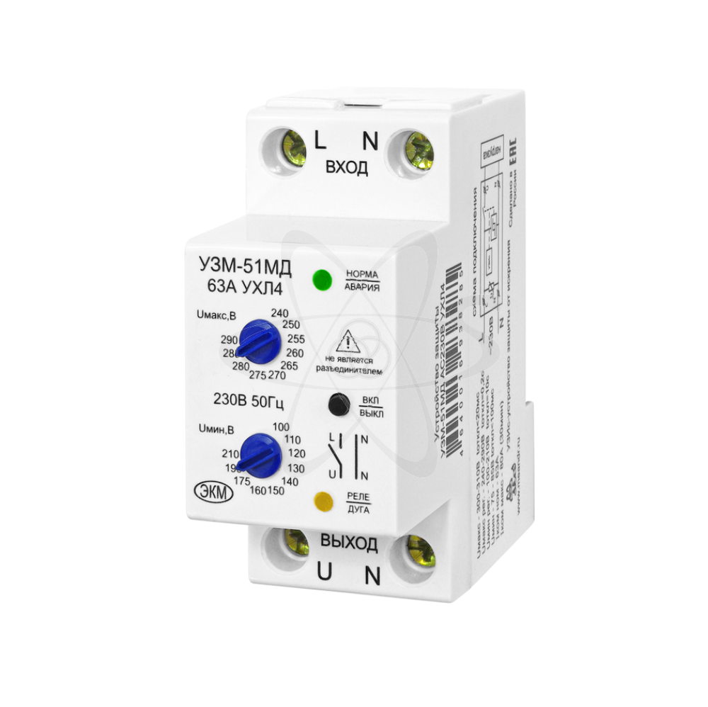 УЗМ (далее - устройство) устройство защиты многофункциональное предназначено для отключения оборудования при снижении или повышении сетевого напряжения в однофазных сетях, защиты подключённого к нему оборудования (в офисе, квартире и пр.) от разрушающего воздействия импульсных скачков напряжения, вызванных срабатыванием близкорасположенных и подключённых к этой же сети электродвигателей,контакторов или электромагнитов, тем самым предотвращая выход оборудования из строя и возможное возгорание с последующим пожаром. УЗМ-51М представляет собой реле контроля напряжения с мощным электромагнитным реле на выходе, дополненное варисторной защитой. Монтаж устройства осуществляется на рейку-DIN шириной 35 мм (ГОСТ Р МЭК 60715-2003) с передним подключением проводов питания коммутируемых электрических цепей. Клемная конструкция обеспечивают надёжный зажим проводов суммарным сечением до 35мм2. На передней панели УЗМ расположены два светодиода – двухцветный (зелёный/красный) «норма-авария» и жёлтый включения контакта реле, кнопка «ТЕСТ» ручного управления. УЗМ-51М дополнительно имеет ручки регулировки верхнего и нижнего порогов отключения. Также применяется в сетях любой конфигурации; TN-C, TN-S, TN-C-S, ТТ. устройство не заменяет другие аппараты защиты (автоматические выключатели, УЗИП, УЗО и пр.). Для удобства пользователей при кратковременных (менее 0,5с) провалах сетевого напряжения, УЗМ не отключает нагрузку и задержки включения не происходит. После подачи напряжения питания устройство выдерживает время готовности 5 секунд при этом индикация не работает, затем зелёный светодиод начинает мигать указывая на отсчёт выдержки времени включения. Если напряжение находится в допустимых пределах, нагрузка подключается к сети питающего напряжения и загораются зелёный и жёлтый светодиоды. Возможно ускоренное включение нагрузки вручную путём нажатия кнопки «ТЕСТ». После аварийного отключения, включение реле происходит автоматически при восстановлении сетевого напряжения до нормального через 10 секунд. При попытке ручного включения в аварийном режиме устройство не позволит включить питание на нагрузку.