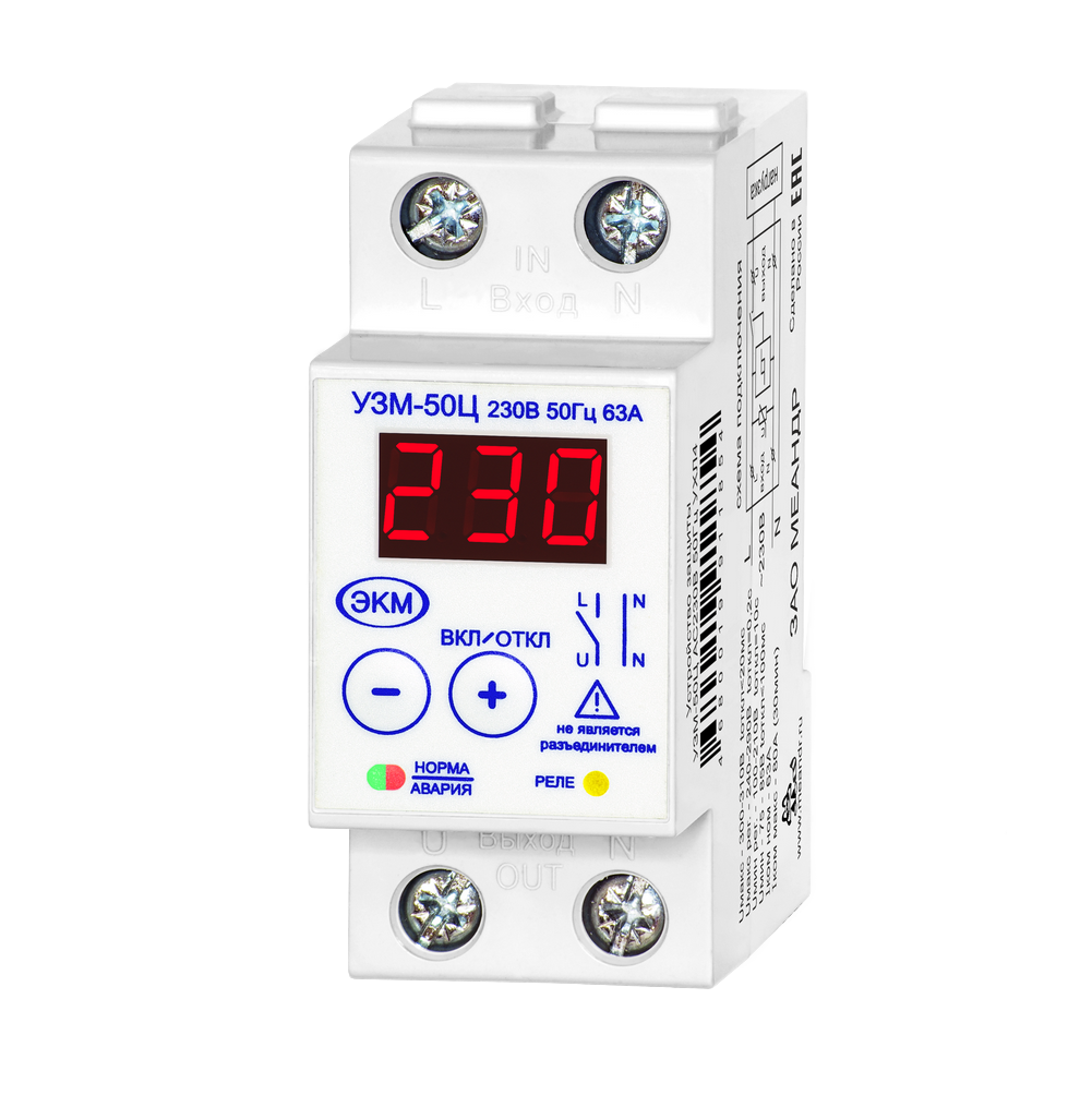 Устройство защиты многофункциональное УЗМ-50Ц (далее устройство) предназначено для использования в квартире, доме, офисе и т.д. с целью защиты однофазных потребителей от работы на повышенном или пониженном сетевом напряжении; защиты однофазных потребителей от разрушающего воздействия импульсных скачков напряжения, вызванных срабатыванием близкорасположенных и подключённых к этой же сети электродвигателей, магнитных пускателей или электромагнитов, а так же защиты сети от длительной перегрузки по потребляемой мощности.