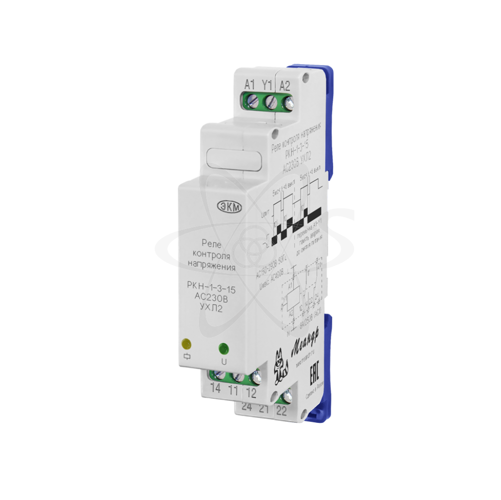 РКН-1-3-15 (далее-реле) реле контроля напряжения предназначено для обнаружения кратковременных пропаданий напряжения в однофазной сети для обеспечения нормального перезапуска системы (например, при срабатывании автоматического включения резерва АВР). Длительность обнаруживаемых провалов - 5мс и более. Питание реле осуществляется от контролируемого напряжения, отдельного напряжения питания не требуется. Реле выпускаются в унифицированном пластмассовом корпусе модульного исполнения с передним присоединением проводов питания и коммутируемых электрических цепей. Монтаж осуществляется на рейку-DIN шириной 35мм (ГОСТ Р МЭК 60715 - 2003) или на монтажную панель. Для установки реле на монтажную панель, фиксаторы замков необходимо раздвинуть. Клемная конструкция обеспечивает надёжный зажим проводов сечением до 2,5мм2. На передней панели расположены: зелёный светодиод включения напряжения питания «U», жёлтый светодиод срабатывания встроенного исполнительного реле. Реле может работать в двух режимах:«работа с памятью» и «работа без памяти». В режиме «работа без памяти» при подаче напряжения питания реле включается через время включения" tвкл" замыкаются контакты 11-14, 21-24 . При обнаружении провала напряжения длительностью от 5 мс и более реле выключается на время аварии и после её устранения вновь включается через время задержки на включение "tвкл". В режиме «работа с памятью» должна быть установлена перемычка между клеммами «Y1» и «А1». При обнаружении кратковременных провалов напряжения реле выключается замыкаются контакты 11-12, 21-22 . Для дальнейшей работы необходимо снять и вновь подать питание на реле. Если длительность провала напряжения превышает время выключения реле tвыкл. - эта авария будет рассматриваться как выключение питания и после её устранения реле вновь включится через время" tвкл".