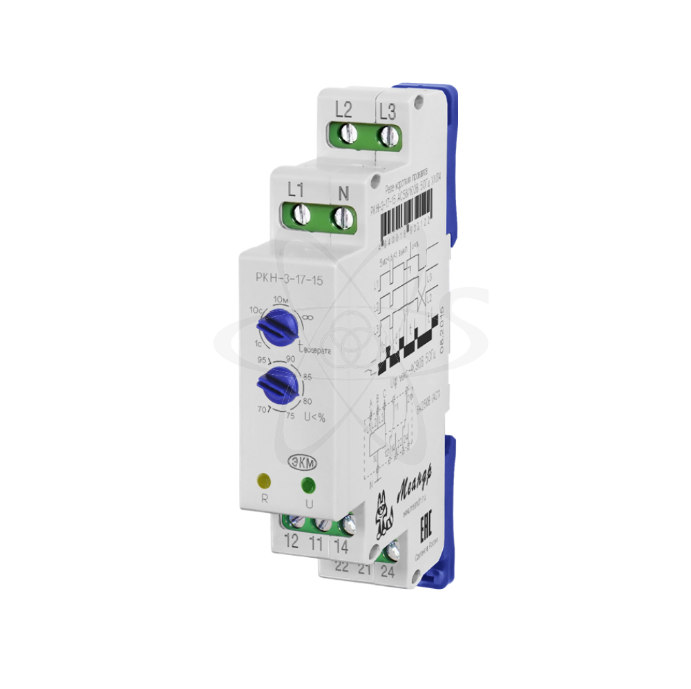 РКН-3-17-15 (далее-реле) реле коротких провалов предназначено для обнаружения кратковременных провалов и пропадания напряжения по одной, двум или всем трём фазам в четырёхпроводных сетях с нейтралью, которые могут привести к отключению электромагнитных пускателей, промежуточных реле и пр. инерционных приборов находящихся в режиме самоблокировки. Также реле предназначено для защиты электрооборудования от понижения напряжения ниже установленного порога срабатывания, обрыва и «слипания» фаз. Реле выпускаются в унифицированном пластмассовом корпусе модульного исполнения с передним присоединением проводов питания и коммутируемых электрических цепей. Монтаж осуществляется на рейку-DIN шириной 35мм (ГОСТ Р МЭК 60715-2003) или на монтажную панель. Для установки реле на ровную поверхность, фиксаторы замков необходимо раздвинуть. Клемная конструкция обеспечивает надёжный зажим проводов сечением до 2,5мм2. На передней панели прибора расположены: декадный переключатель установки времени срабатывания исполнительного реле «t возврата», декадный переключатель установки порога срабатывания на снижение напряжения «U<%», зелёный светодиод включения напряжения питания «U», жёлтый светодиод срабатывания встроенного исполнительного реле «R». Реле питается от контролируемой сети трёхфазного напряжения. Для этого необходимо подключить три контролируемые фазы к клеммам L1, L2, L3 и нулевой провод к клемме N. Для установки времени включения исполнительного реле 10с или 10мин указатель потенциометра должен быть установлен по середине соответствующего сектора шкалы. При задержке 1с стрелка устанавливается в крайнее левое положение, а при задержке «∞» - в крайнее правое . При включении питания исполнительное реле включится через 1с, если на регуляторе времени установлено время «1с». Если на регуляторе времени установлено любое другое время, включение реле произойдёт через 10с. При обнаружении короткого провала напряжения ниже установленного порога длительностью более 10мс по одной, двум или трём фазам, реле выключится на время аварии и после её устранения включится вновь, через время установленное на регуляторе времени «t возврата». Аналогичным образом реле работает при любой другой аварийной ситуации (обрыв и «слипание» фаз, снижение напряжения ниже установленного порога срабатывания). t возврата - время установленное на регуляторе времени (значения 1с, 10с, 10м), в положении «∞» функция повторного включения после самоустранения аварии отключена. U<% - регулятор порога срабатывания на снижение напряжения «U<%». Значения устанавливаются в процентах от номинального напряжения.
