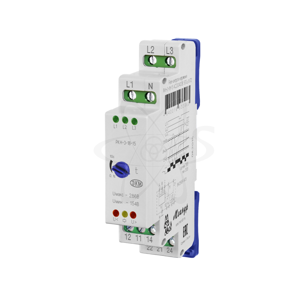 РКН-3-18-15 (далее-реле) реле контроля напряжения предназначено для контроля наличия и «слипания» фаз в цепях трёхфазного напряжения в четырёхпроводных сетях с нейтралью, а также для контроля снижения (превышения) напряжения ниже (выше) фиксированного порога. Реле выпускаются в унифицированном пластмассовом корпусе модульного исполнения с передним присоединением проводов питания и коммутируемых электрических цепей. Монтаж осуществляется на рейку -DIN шириной 35 мм (ГОСТ Р МЭК 60715 - 2003) или на монтажную панель. Для установки реле на ровную поверхность, фиксаторы замков необходимо раздвинуть. Клемная конструкция обеспечивает надёжный зажим проводов сечением до 2,5мм2. На передней панели прибора расположен поворотный регулятор времени срабатывания, красные светодиоды ошибок сети («U>», «U<»), жёлтый светодиод включения встроенного электромагнитного реле, три зелёных светодиода «L1», «L2», «L3» для индикации обрыва фаз. Реле не требует дополнительного питания и питается от контролируемой сети трёхфазного напряжения. Для этого необходимо подключить три контролируемые фазы к клеммам L1, L2, L3 и нулевой провод к клемме N. Задержка срабатывания реле выставляется поворотным регулятором времени срабатывания. При подаче питания, если установлена задержка срабатывания и все контролируемые параметры находятся в норме, реле включится по окончании отсчёта времени задержки t, при этом разомкнуты контакты 11-12, 21-22 , а контакты 11-14, 21-24 - замкнуты. Мигающий светодиод сигнализирует об отсчёте задержки времени срабатывания, по окончании которой встроенное электромагнитное реле переключается. При отклонения одного из параметров от номинального значения, включается индикация ошибки и реле выключается по окончании отсчёта задержки срабатывания, если она установлена. При возвращении контролируемого параметра в норму, индикация ошибки выключается сразу, а реле включается по окончании задержки срабатывания. При пропадании всех трёх фаз реле выключается без отсчёта задержки времени срабатывания установленной пользователем.