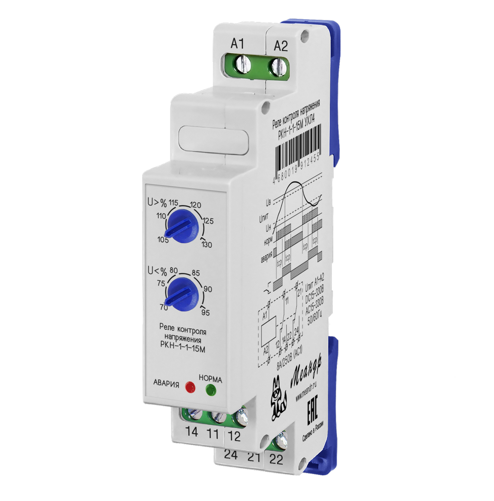 Реле контроля напряжения РКН-1-1-15М (далее реле) предназначено для выдачи команды управления при отклонении контролируемого напряжения от установленных пороговых значений. Может применяться в качестве реле максимального или минимального напряжения или реле контроля аварийного состояния (контроль двух порогов одновременно, т.е. контроль «окном»). Питание реле осуществляется от контролируемого напряжения, отдельного напряжения питания не требуется. Технические характеристики реле приведены в таблице.