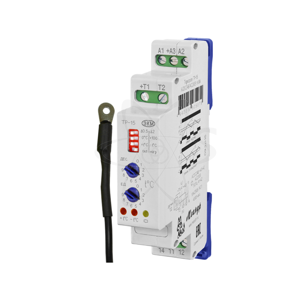 ТР-15 (далее-реле) температурное реле предназначено для контроля и поддержания заданного температурного режима по сигналам датчика температуры, созданного на базе микросхемы DS18B20 Dallas Semiconductor (Maxim) в помещениях, системах водяного отопления,овощехранилищах,жидкостей, охлаждающих систем, предметов и т. п., а также для использования в качестве комплектующего изделия в устройствах автоматики. Реле поставляется в комплекте с датчиками ТД-2 (указать при заказе). Реле выпускаются в унифицированном пластмассовом корпусе модульного исполнения с передним присоединением проводов питания и коммутируемых электрических цепей. Монтаж осуществляется на рейку-DIN шириной 35 мм (ГОСТ Р МЭК 60715 - 2003) или на монтажную панель. Для установки реле на монтажную панель, фиксаторы замков необходимо раздвинуть. Клемная конструкция обеспечивает надёжный зажим проводов сечением до 2,5мм2. На передней панели реле расположены: DIP-переключатель для задания зоны гистерезиса «∆0,5/∆2», для выбора диапазона температуры «00С\+100», для задания положительной или отрицательной температуры «+t0С/-t0С», для выбора режима работы «охл./нагр.», декадный переключатель «ДЕС.» для задания десятков температуры, декадный переключатель «ЕД.» для задания единиц температуры, красный светодиод «+t0С» нагревания, синий светодиод «-t0С» охлаждения, жёлтый светодиод срабатывания встроенного исполнительного реле. Реле работает в двух режимах: «нагрев» или «охлаждение». «Нагрев» - режим, при котором исполнительное реле включено, если контролируемая температура ниже установленной (нагреватель). «Охлаждение» - режим, при котором исполнительное реле включено, если контролируемая температура выше установленной (холодильник). Режим работы выбирается с помощью переключателя «охл./нагр.». Включение исполнительного реле контролируется жёлтым светодиодом. Когда реле включено, горит жёлтый светодиод и контакты 11-14 замкнуты . В режиме «нагрев» при включении питания, если температура в контролируемой точке будет ниже установленной, реле включится. По достижении установленной температуры (t0Суст) - реле выключится. При остывании, повторное включение реле произойдёт при температуре t0Суст - ∆. В режиме «охлаждение» при включении питания, если температура в контролируемой точке будет выше установленной, реле включится. По достижении установленной температуры реле выключится. При последующем повышении температуры, реле включится при температуре t0Суст.+∆.